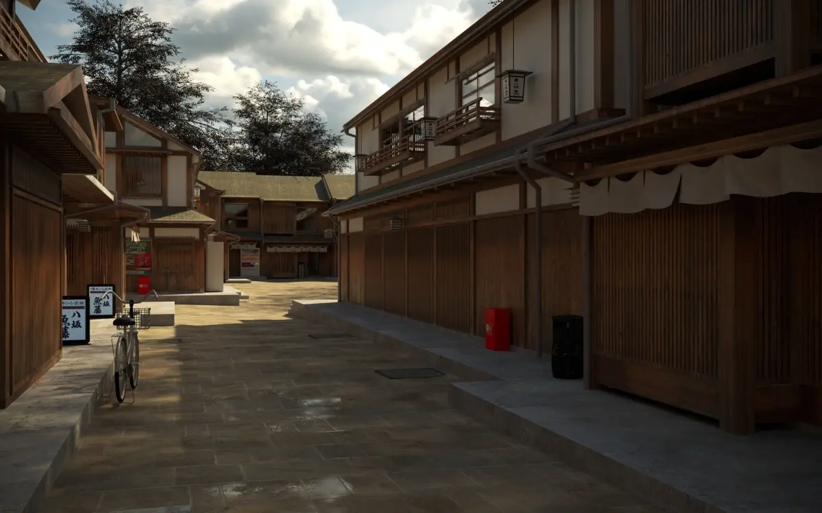 Just randomly searched on the Internet and I found a very beautiful Japanese town in Kytoto in Japan. I created this scene based on the town I found on Google map.