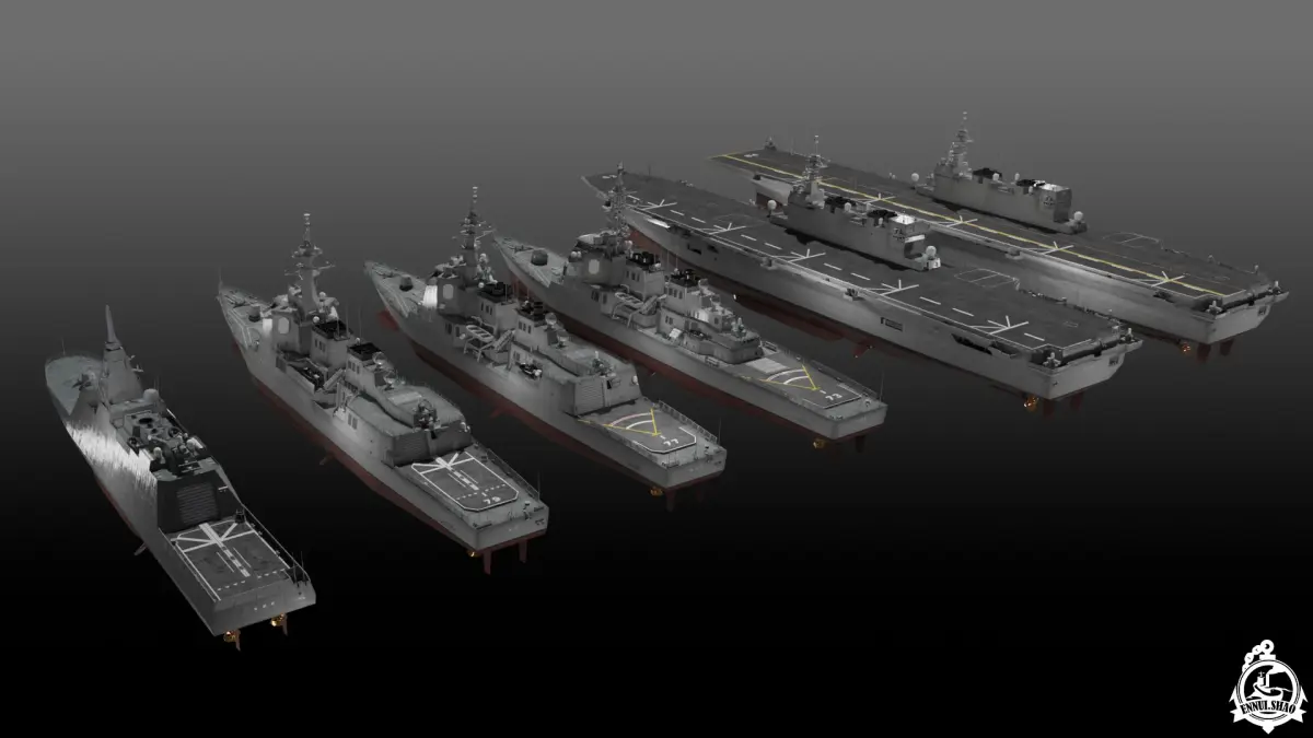 Surface warships of JMSDF, Helicopter carrier Kaga DDH-184, Izumo DDH-183, Guided missile destroyer Kongo DDG-173, Atago DDG-177, Maya DDG-179 and Multi-purpose Frigate Mogami FFM-1. Modeled with Blender 3.3. PBR materials. Vertices number of each model is between 100-200k. UV unwrapped for main hull of each ship. FBX and OBJ format supported. Some materials may only work properly under blender.