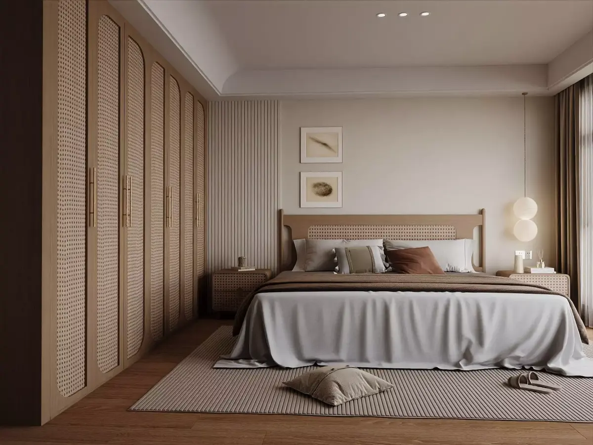 A serene Japandi master bedroom crafted around warm light wood, soft textiles and timeless cane details. The bed anchors the composition with a gentle platform profile and a woven headboard panel that echoes the bespoke wardrobe opposite. Full-height doors use arched frames and rattan inserts with elongated brass pulls, adding rhythm and handcrafted warmth without visual weight. On both sides, rounded nightstands mirror the cabinet language so the set reads calm and consistent. Above, a delicate two-globe pendant pools a cozy glow that layers with discreet ceiling spots.The palette remains quiet—stone, oatmeal and taupe—so texture becomes the ornament: the ribbed area rug softens footsteps, cotton and linen drape naturally across the bed, and subtle wall grooving adds vertical cadence behind framed abstract prints. Natural daylight washes in from the side to reveal the depth of the weave and the grain of the floor. Circulation is generous around the bed and the furniture proportions follow comfortable residential dimensions, ideal for camera moves and close-ups. This scene is perfect for showcasing calm, hospitality-grade styling in apartments, villas or hotel suites where material honesty and everyday usability meet refined, sale-ready visuals.