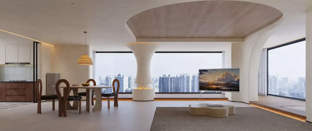 Warm open-plan living–dining–kitchen set with a sculptural fireplace column, curved wood ceiling and black stone island. Soft neutral palette, creamy plaster and Japandi details create quiet luxury. Assets are clean and organized: real-world scale (meters), grouped by function, named materials, tidy UVs and centered pivots for fast look-dev. Non-branded, versatile forms suitable for residential marketing, hospitality mockups and animation.