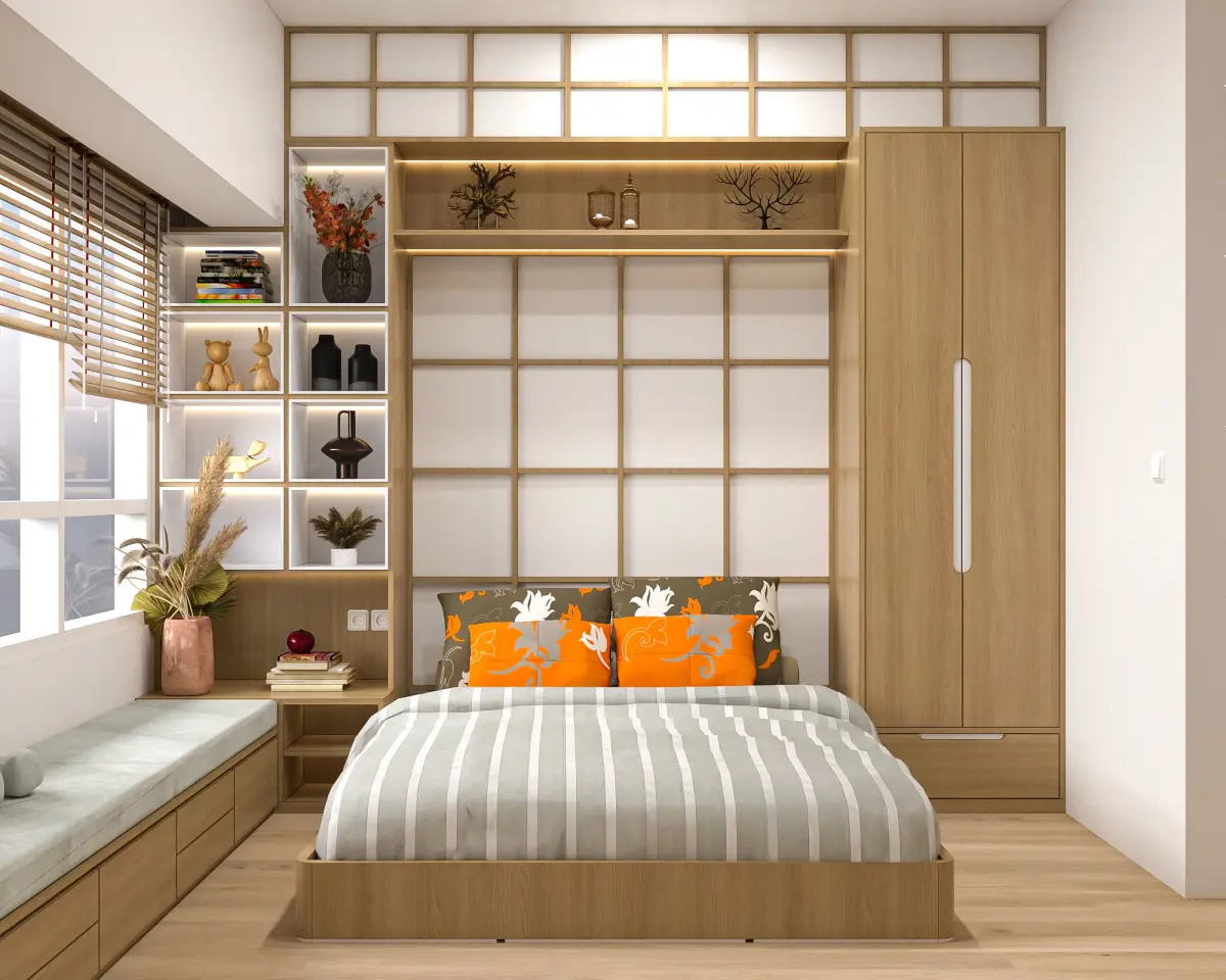 Bench Chair in front of the window is both utilitarian and relaxing. A long bench with storage below not only adds sitting but also offers useful storage space. The placing of teddy bears and cushions provides a nice personal touch. The open shelf next to the window serves as both a storage place and a decorative feature, emphasising the Japandi notion of striking a balance between utility and appearance.