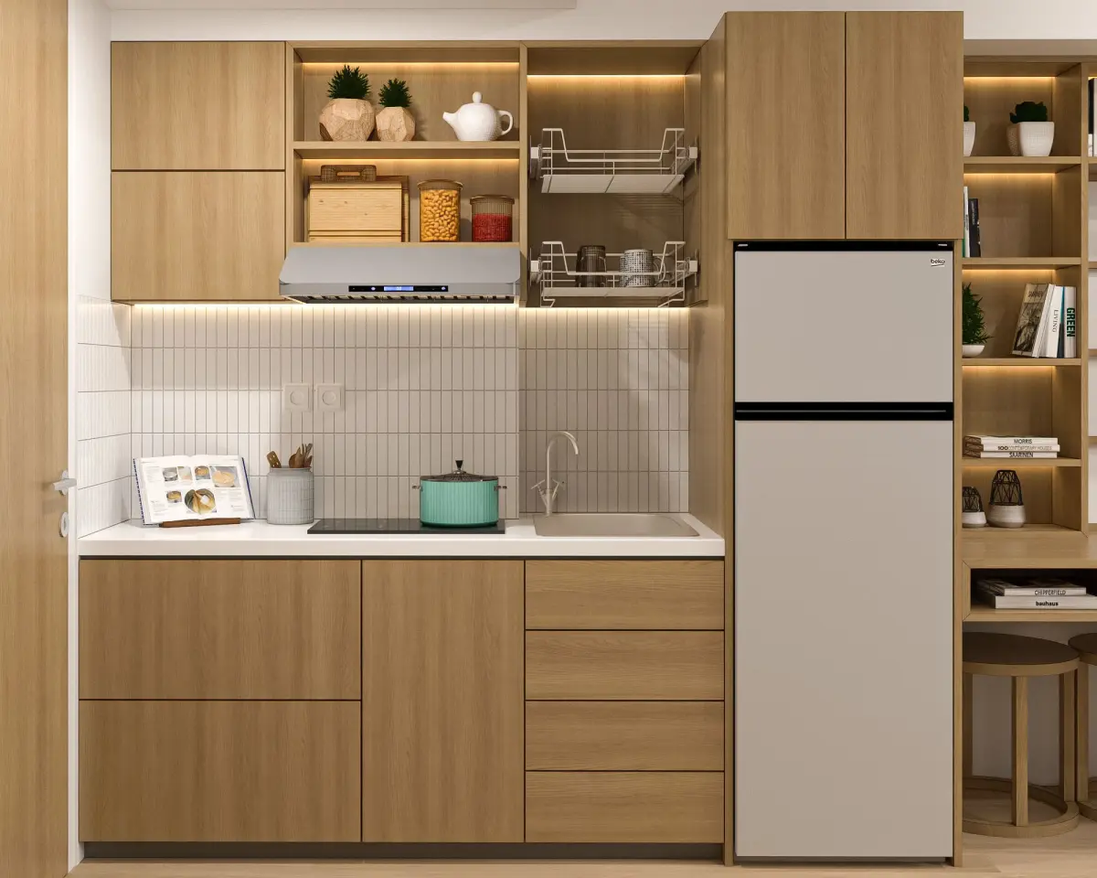 The interior design of this studio apartment follows the Japandi idea, which mixes Japanese and Scandinavian elements to create a minimalist yet comfortable ambiance. The predominant use of natural wood colours on wall panels, flooring, and furniture produces a natural and pleasant atmosphere. In the kitchen, open shelves with hidden lighting provide a tidy and practical appearance, while cooking utensils and other equipment are well-stored so that they do not detract from the overall design.