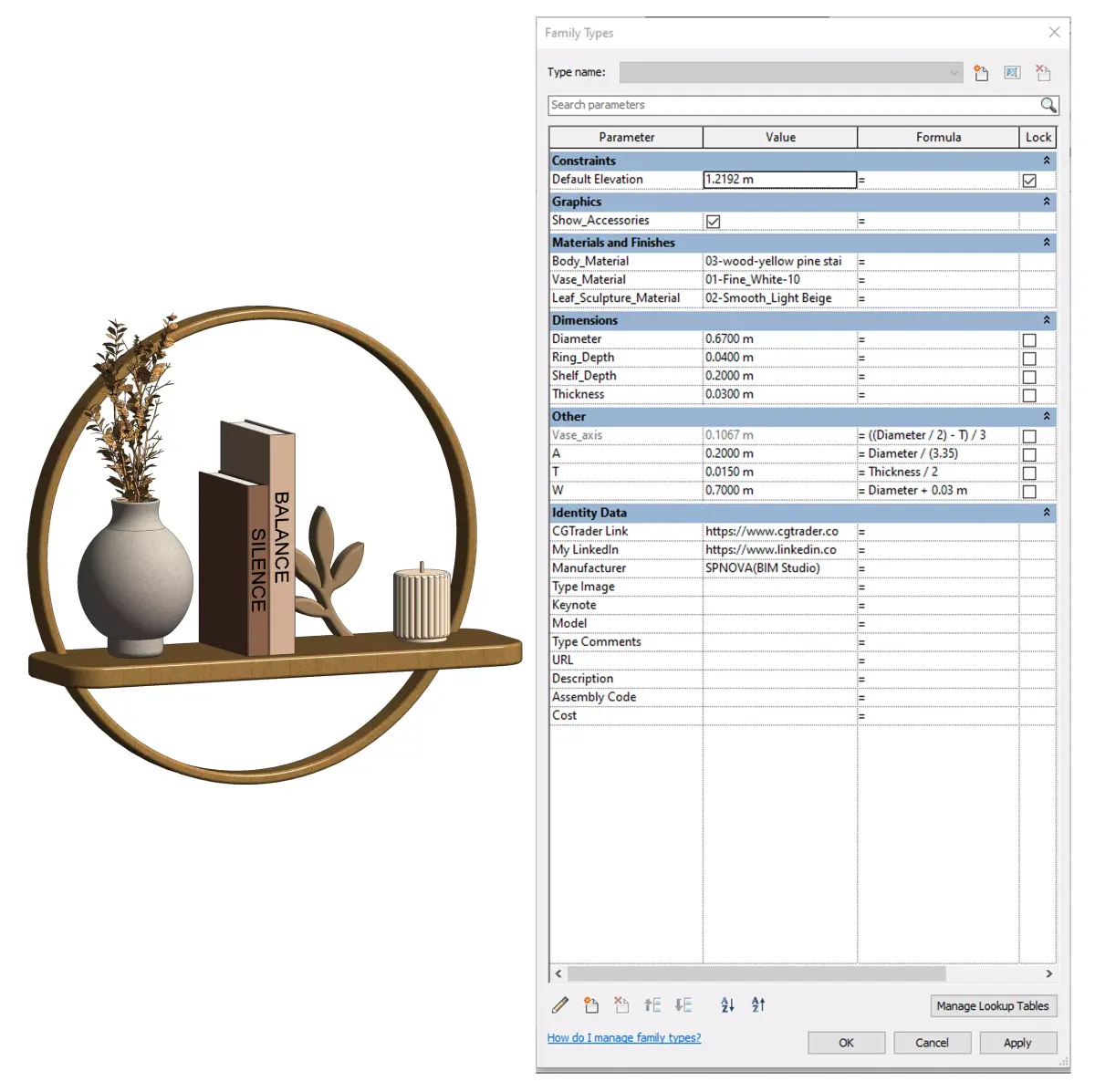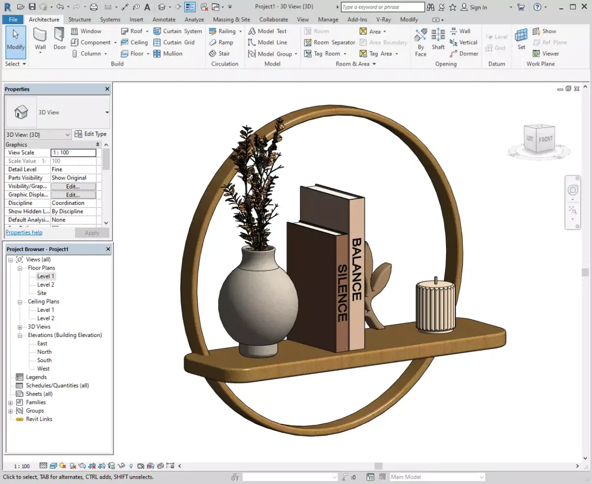 Minimal circular wall shelf modeled in Revit, suitable for modern and Japandi-style interiors.