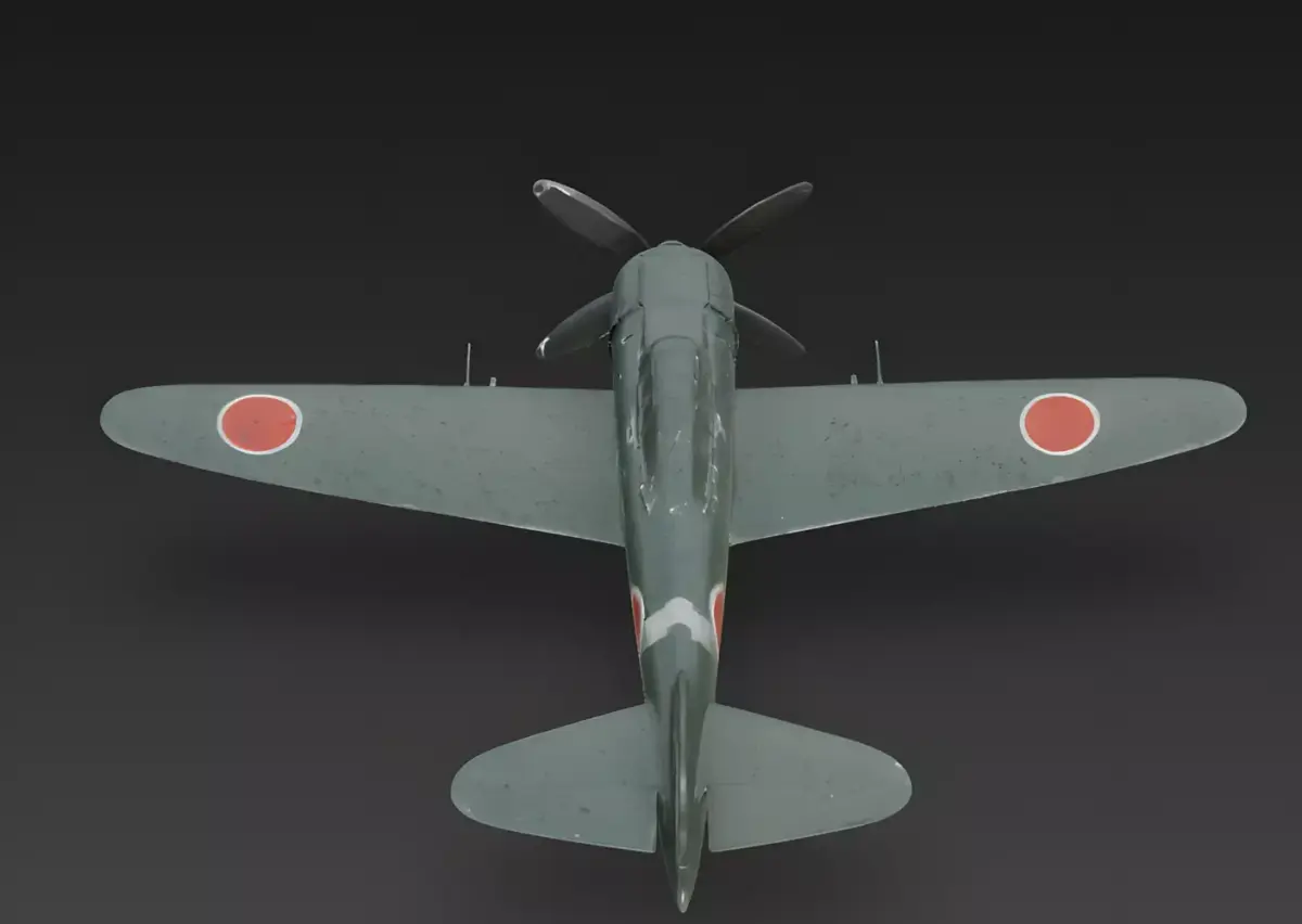 Weathered IJN Green and Metallic Chipping FinishThe aircraft features a primary body finish of heavily weathered IJN dark green enamel, meticulously modeled with realistic surface oxidation, massive paint-chipping along the leading edges and wing-roots, and prominent rivet-line tarnish. This professional and grounded appearance provides a clear visual story of high-intensity combat endurance in a corrosive maritime environment and provides a sharp visual contrast against the vibrant red Hinomaru (sun disc) insignias.
