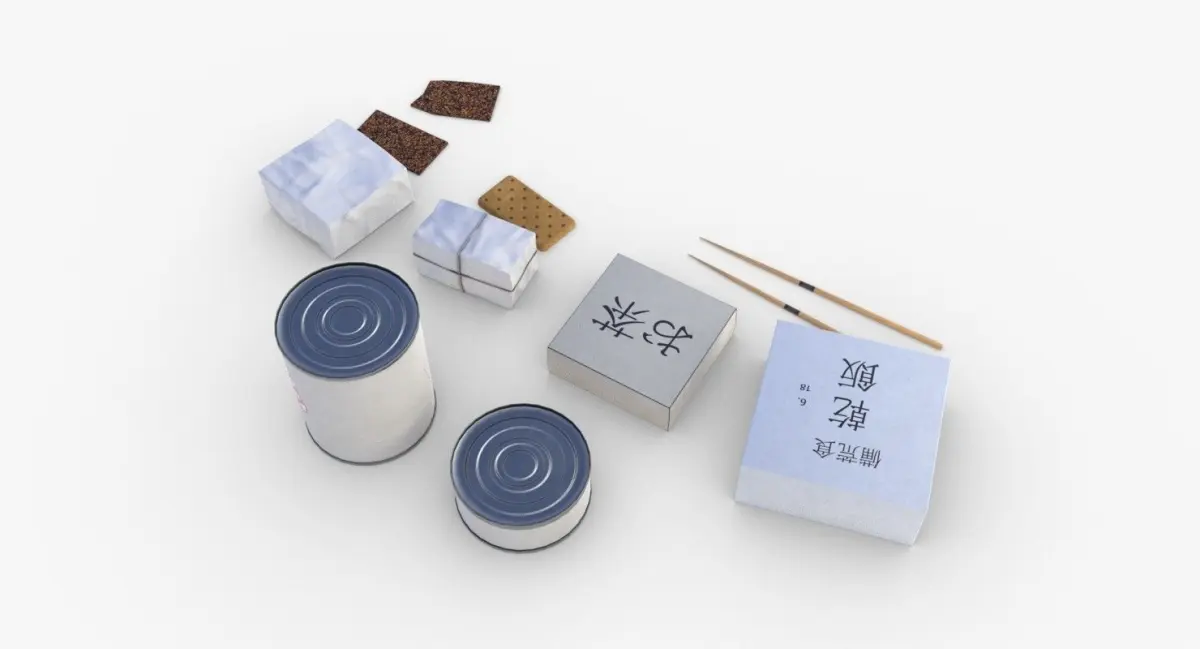 This is a model of a japanes army combat rations set used during the Second World War for soldiers on the front. The model include many differents objects :