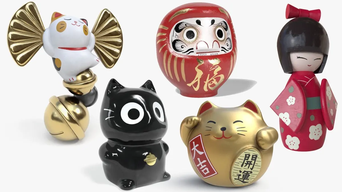 The collection pack contains 5 models ( Japanese kokeshi doll, Japanese fortune cat gold, Japanese Daruma doll, Japanese cat with fan and Japanese fortune cat black )