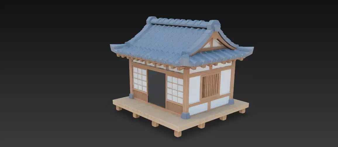 A stylized Japanese house with clean low‑poly geometry, curved tiled roof, wooden beams, shoji windows, and game‑ready topology. Perfect for RPG, adventure, mobile, VR, and stylized environments.