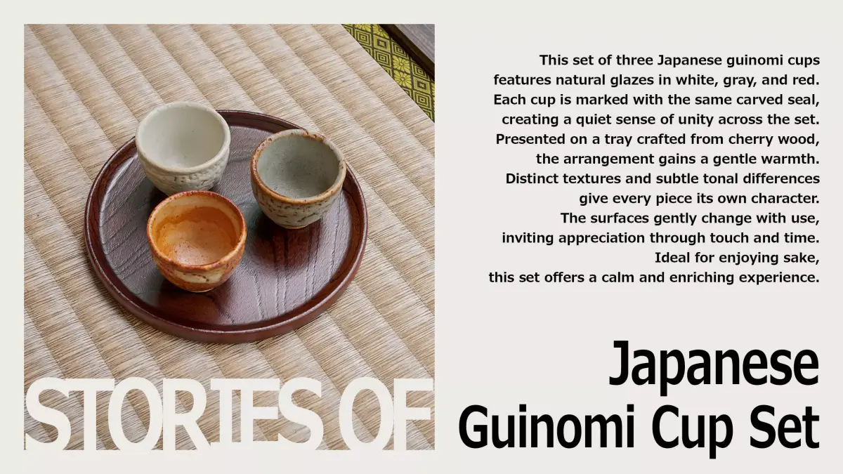 This set of three Japanese guinomi cupsfeatures natural glazes in white, gray, and red.Each cup is marked with the same carved seal,creating a quiet sense of unity across the set.Presented on a tray crafted from cherry wood,the arrangement gains a gentle warmth.Distinct textures and subtle tonal differencesgive every piece its own character.The surfaces gently change with use,inviting appreciation through touch and time.Ideal for enjoying sake,this set offers a calm and enriching experience.