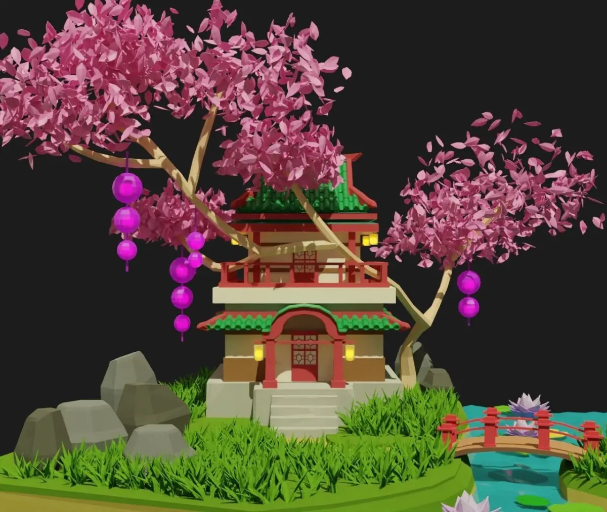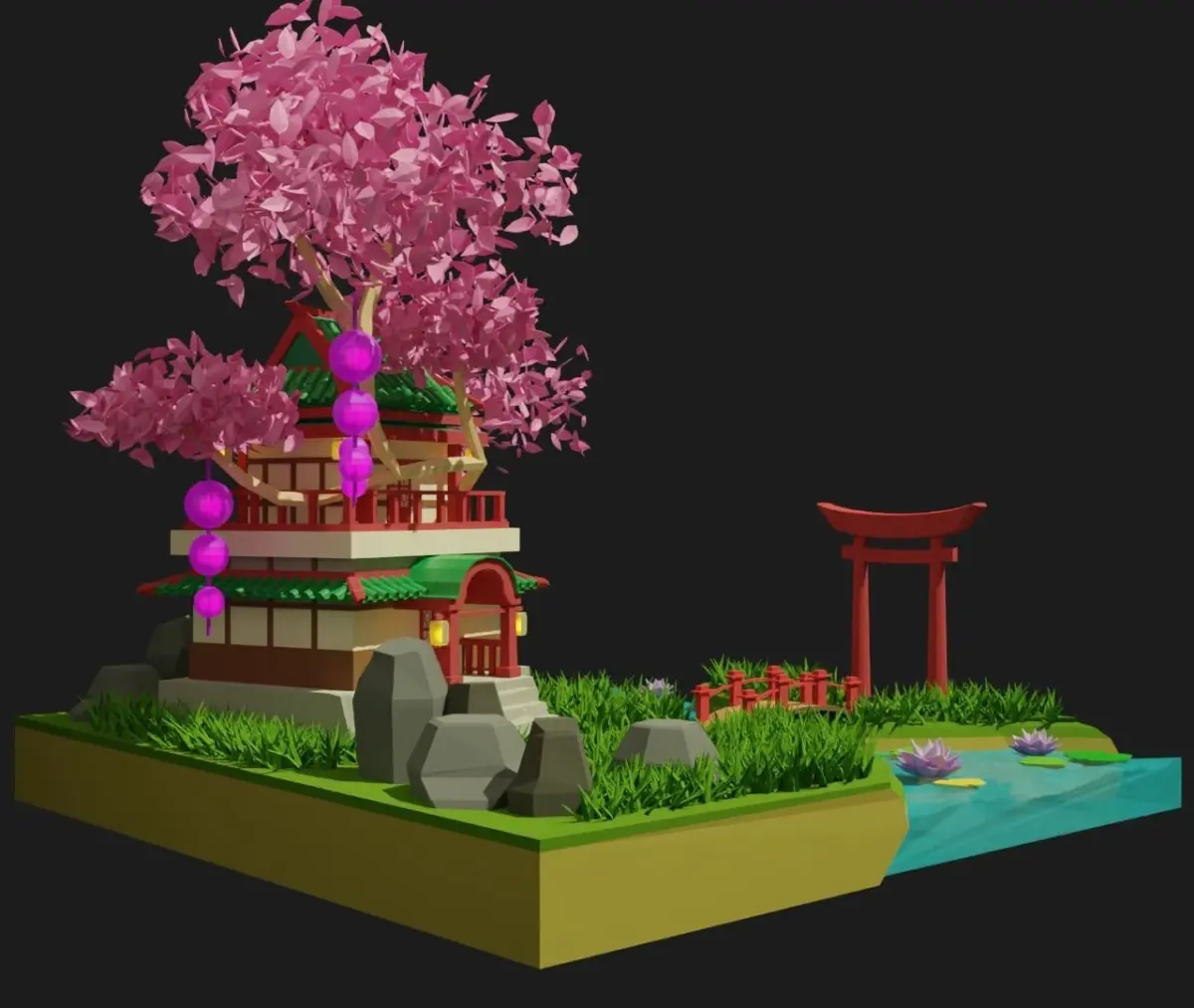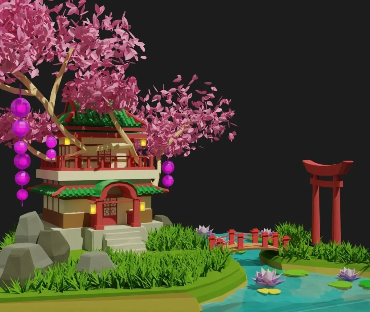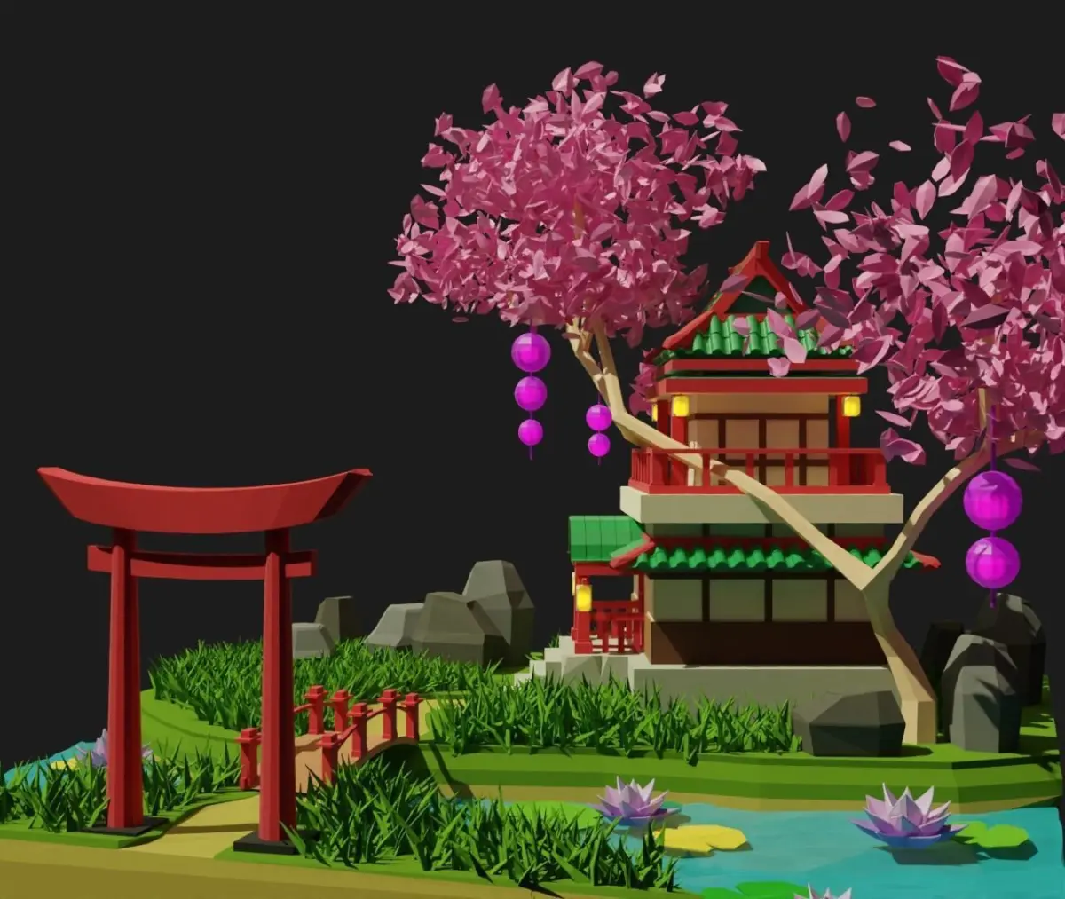I created this Japanese House (pagoda/temple) using Blender 3.0.1 as a low poly object. There are a House, a cherry/Sakura tree, a torii gate, a pond with lotus and some Lanterns.