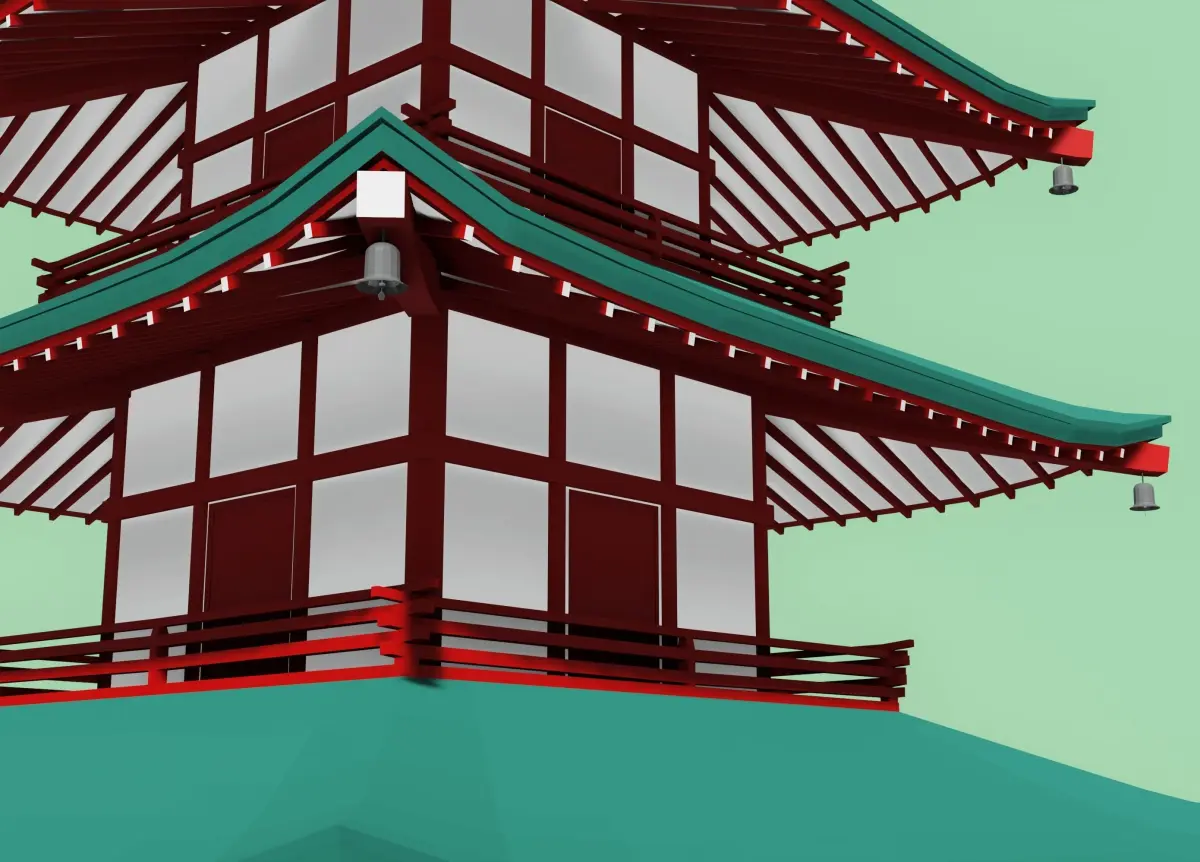 Japanese pagoda and a torii. A pagoda is a tiered tower with multiple eaves common to China, Japan, Korea, Vietnam and other parts of Asia.Created in Blender