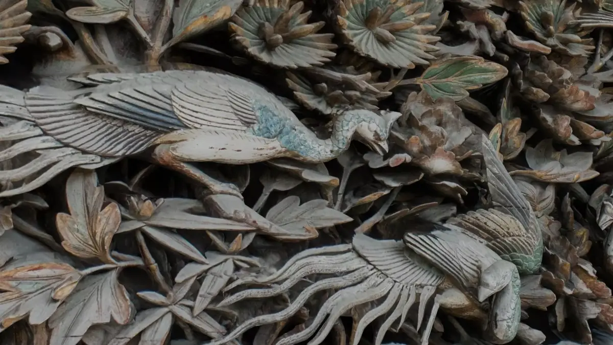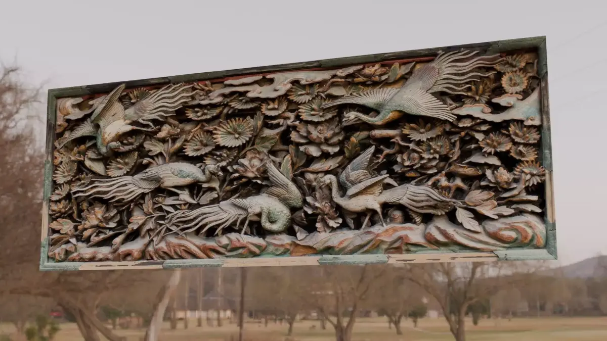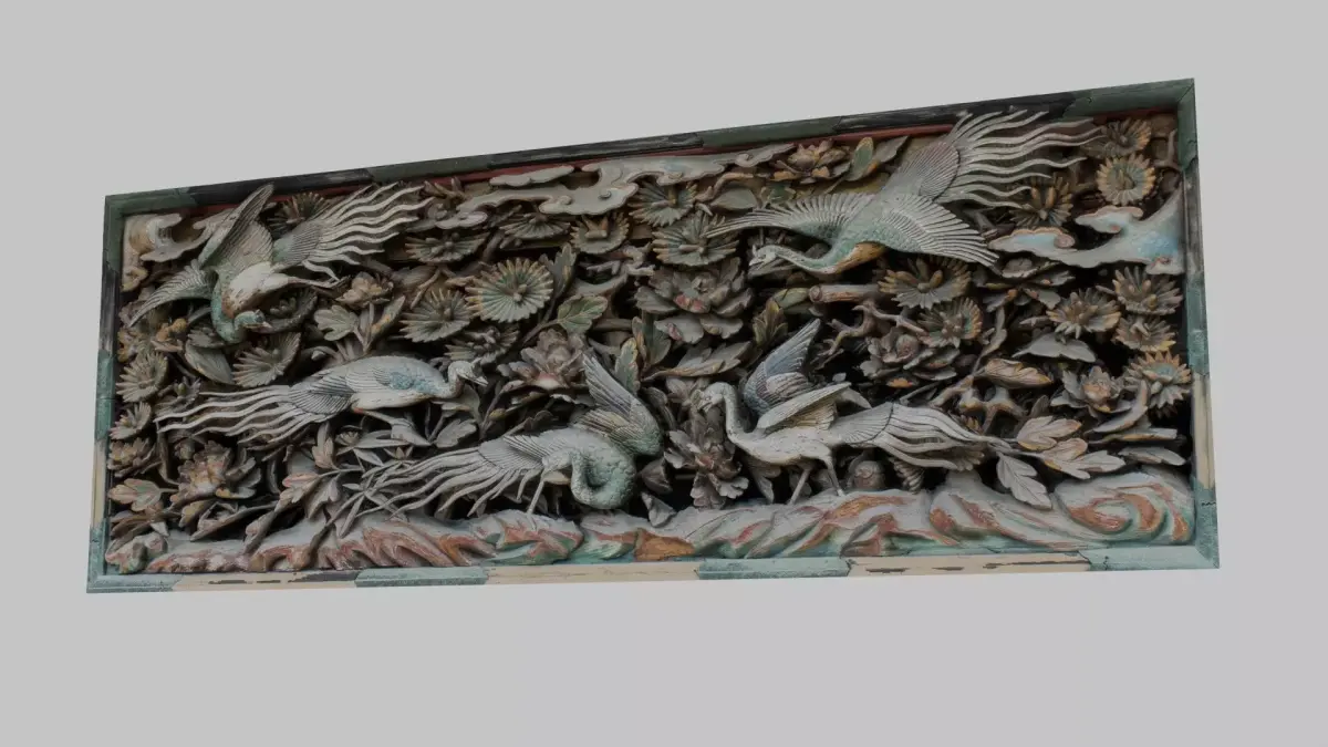 Photogrammetry scan of a traditional Japanese ranma transom panel featuring intricately carved cranes amid peony blossoms. Polychrome painted wood with aged patina. 8K diffuse and normal textures, 3 LODs included (100K/20K/5K tris).