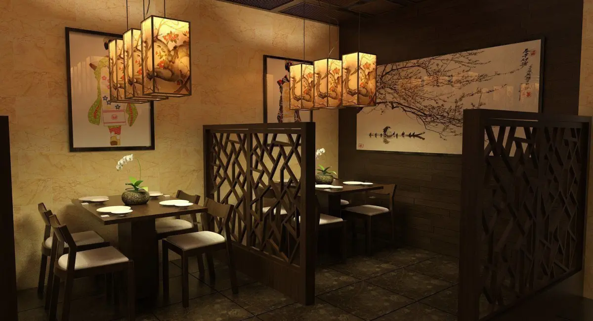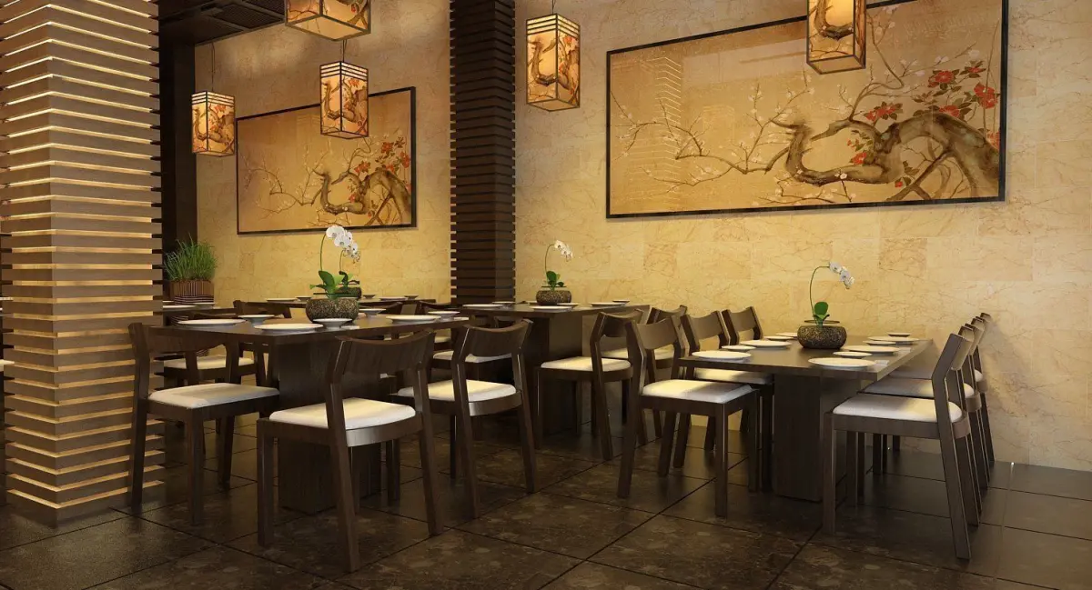 This is a detailed model of fully furnished restaurant scene.