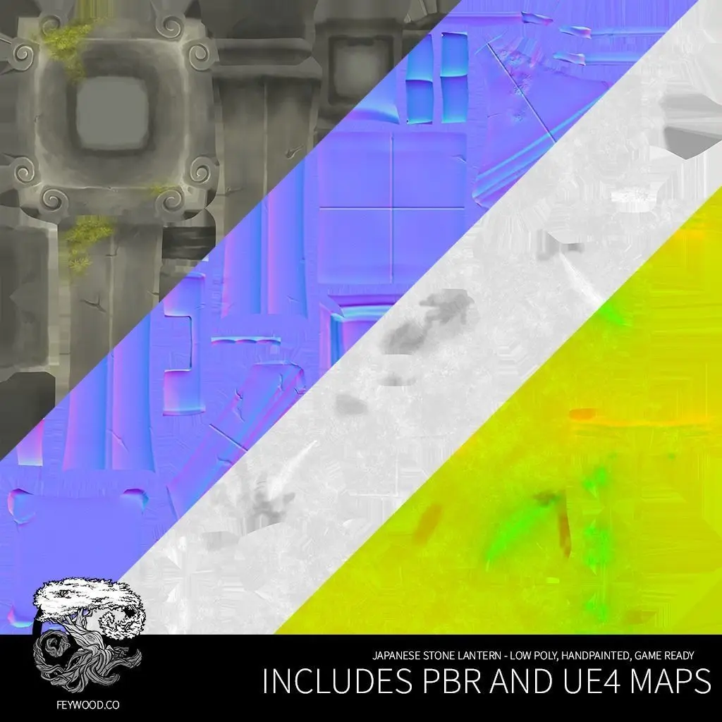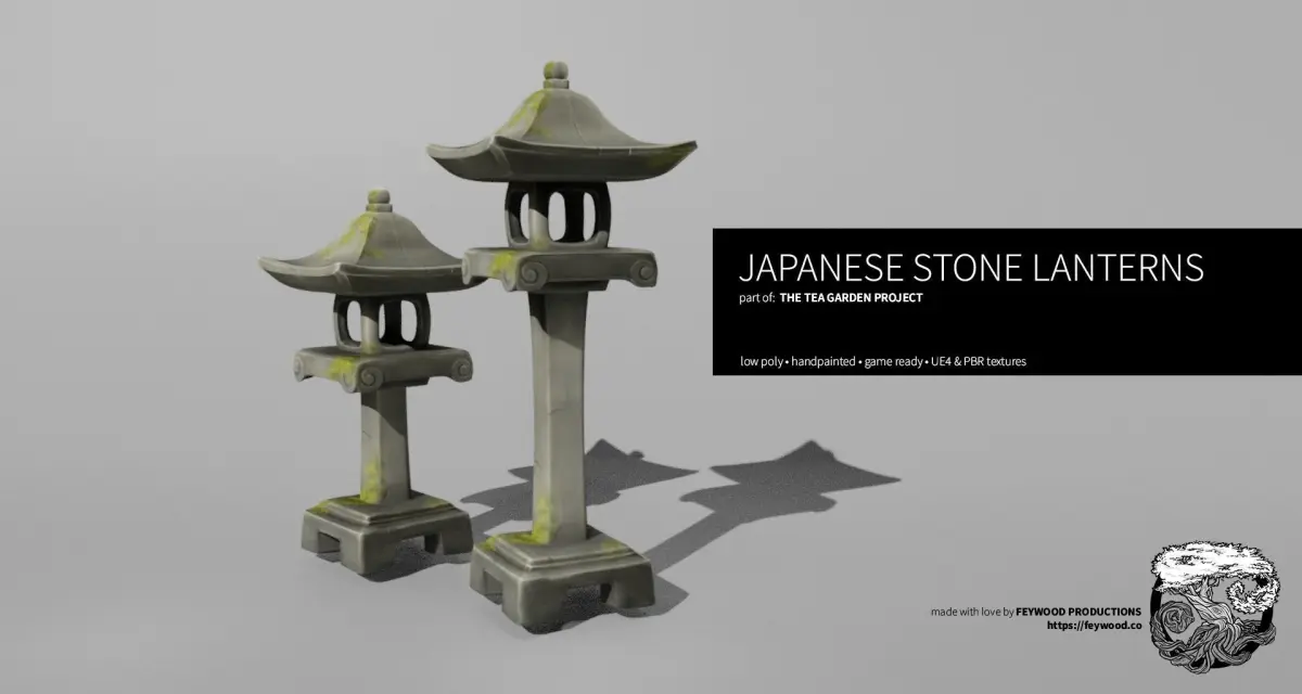 An iconic part of every Japanese scene is the stone lantern. This model was lovingly sculpted and hand-painted to achieve an artful, stylized look. This game-ready prop is optimized for clean subdivision for use in multiple levels of detail. It includes both PBR and UE4 textures, with moss and no moss variants, in 3 resolutions: 4k, 2k, and 1k. The prop is designed and exported to real-life scale at aprox 3ft tall for the tallest lantern.
