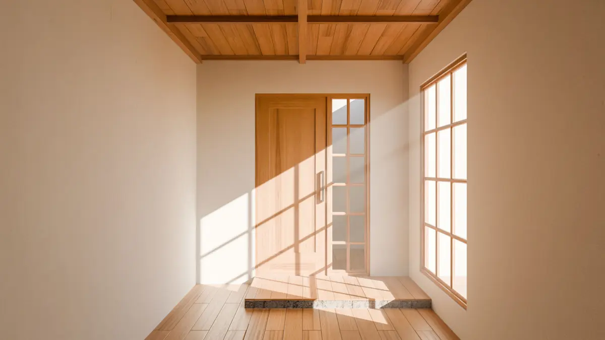 Japanese style room with a wooden door and windows. The room is empty and has a simple design. The sunlight coming in through the windows creates a warm and inviting atmosphere.