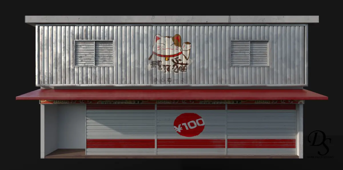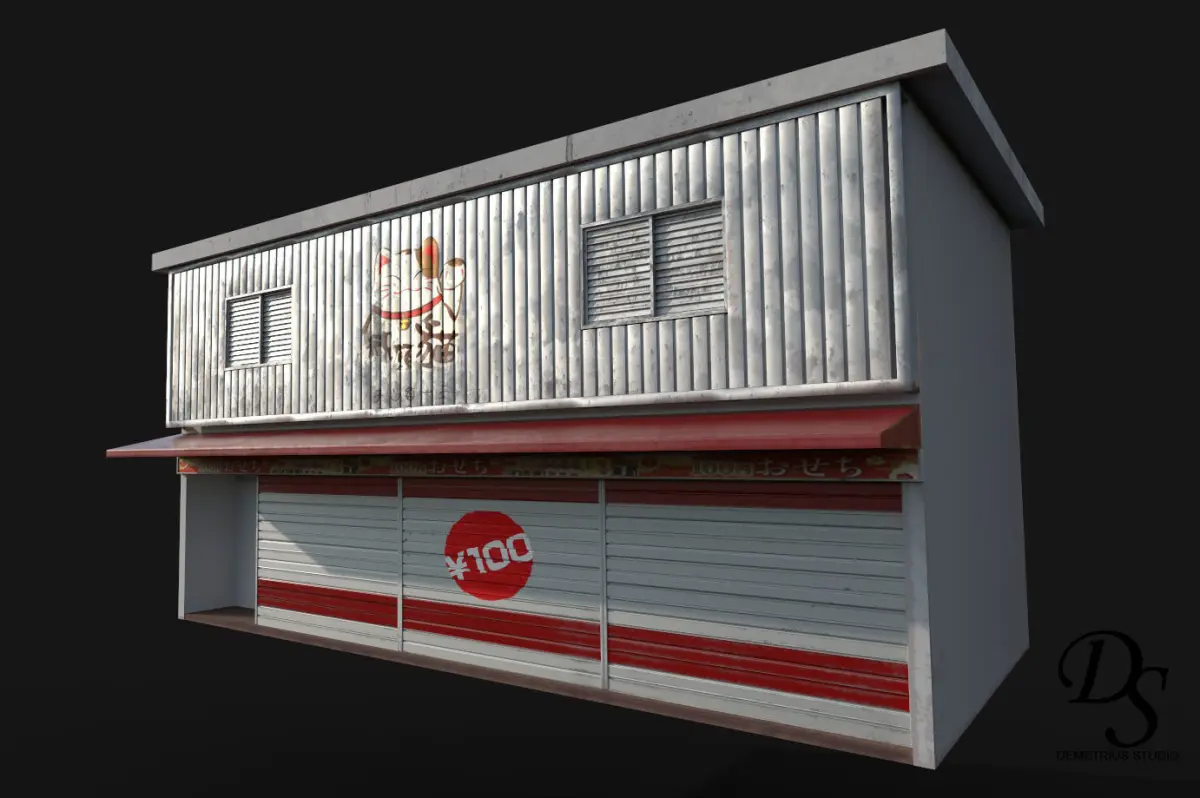 a 2 storeys small japanese style shop, vending machine can be be inserted on the left side corner