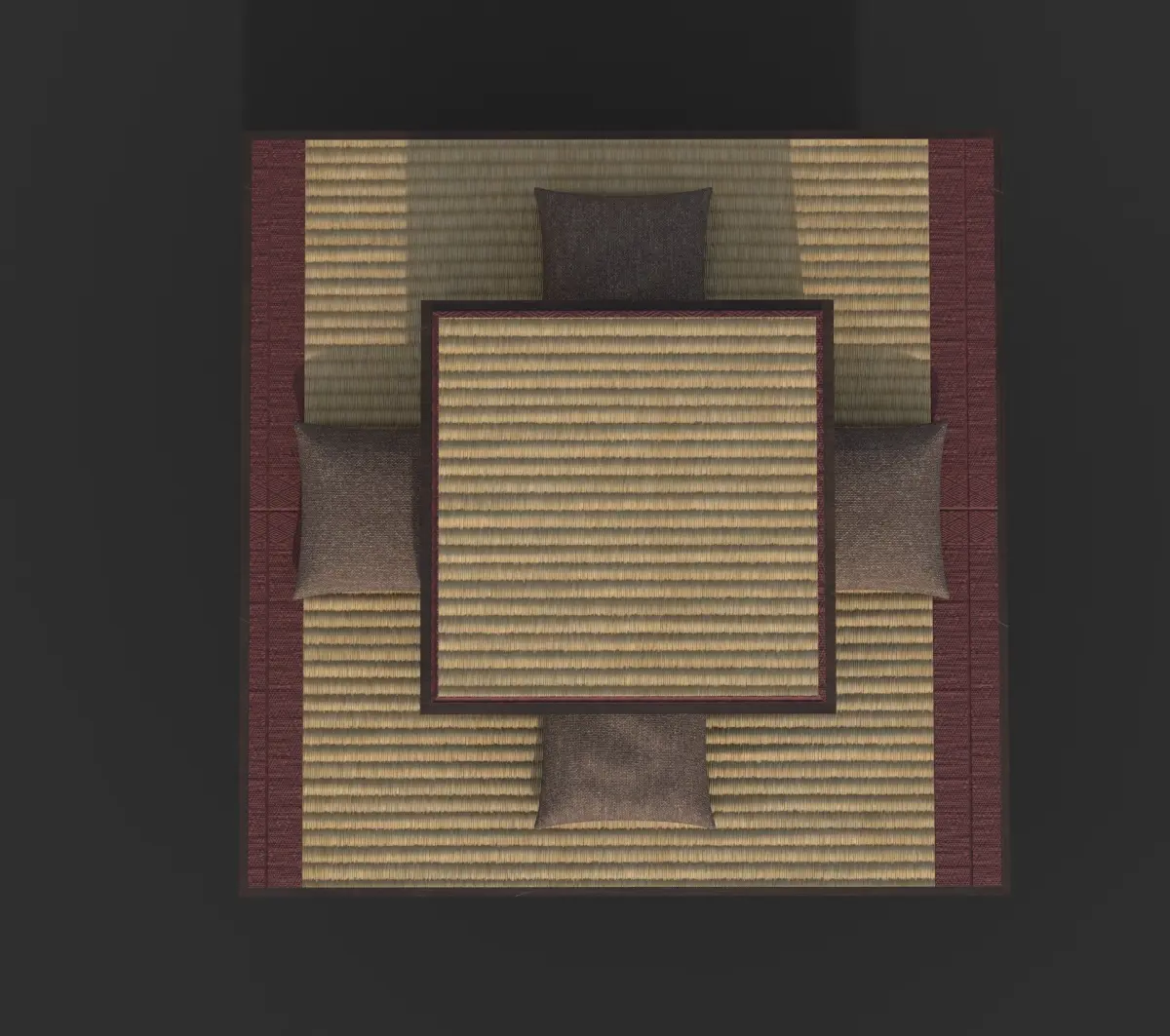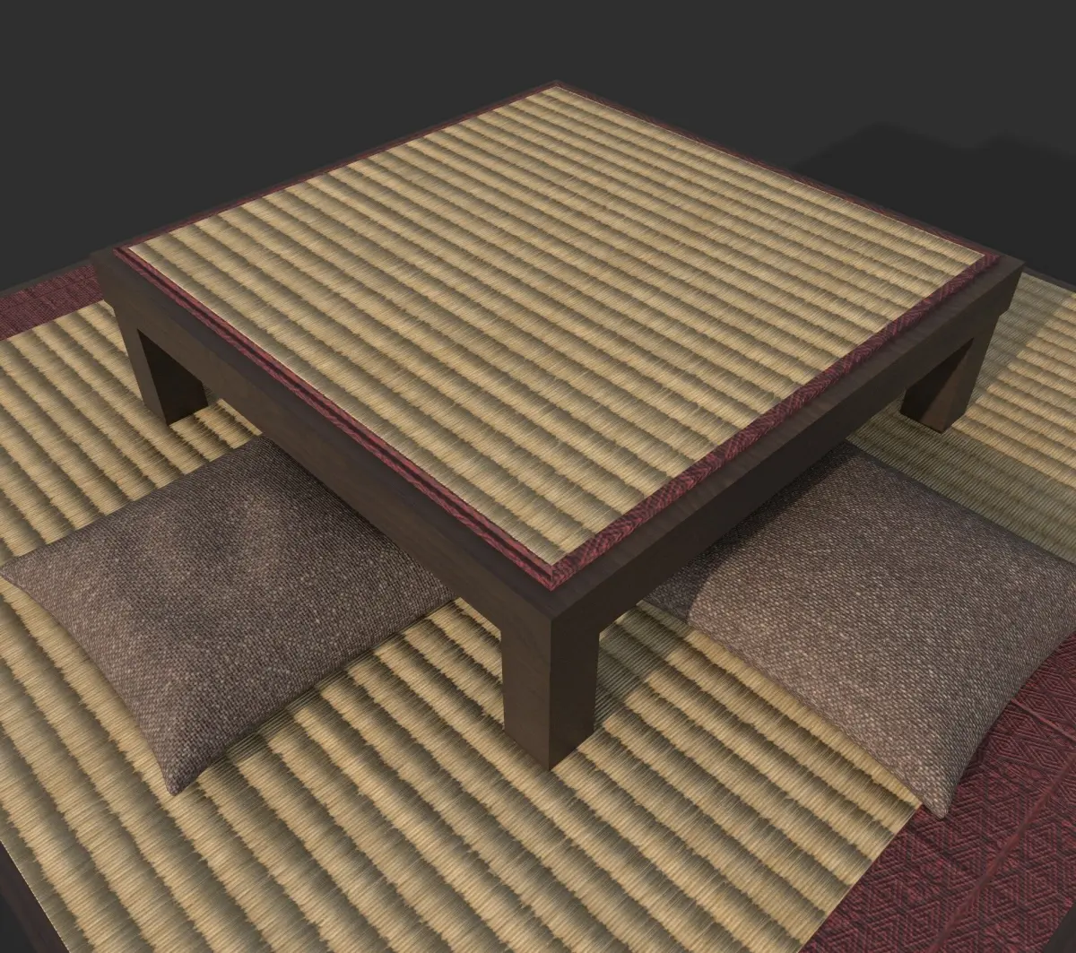This 3D model depicts a traditional Japanese-style low table set on a tatami mat platform, surrounded by floor cushions. The design features natural wood textures, woven mat details, and a minimalist aesthetic with cultural authenticity. One single 2k texture, mesh already triangulated. Contains substance painter file to adjust the colors