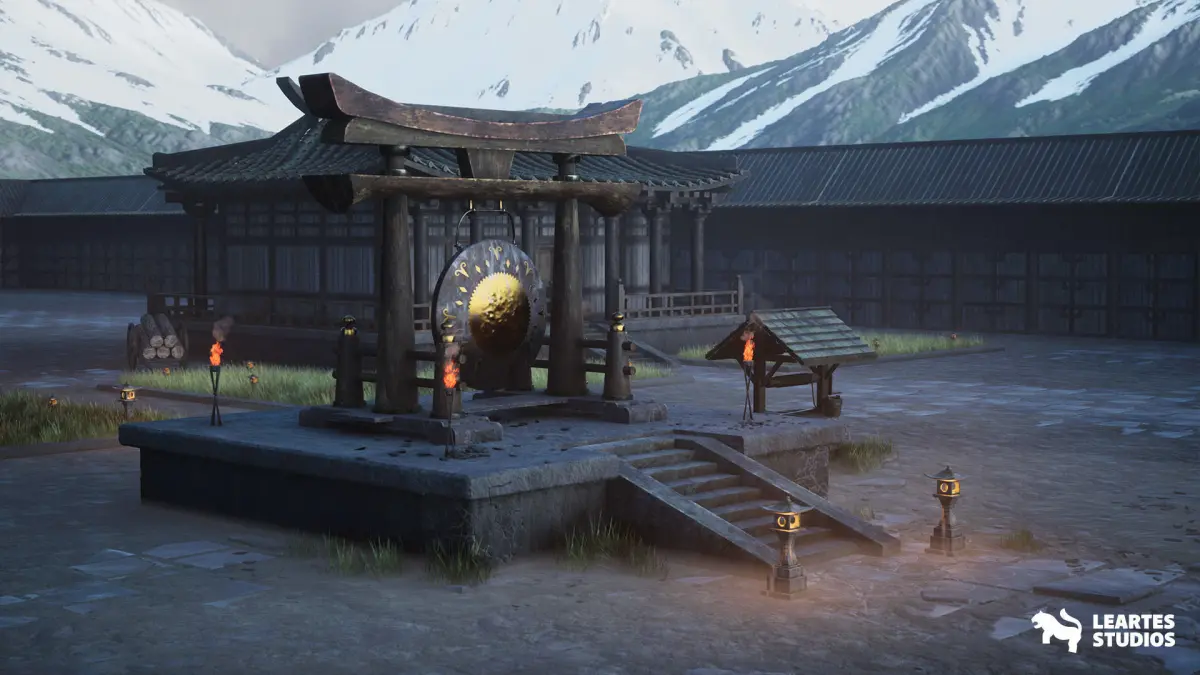 Imagine a Japanese temple with a massive wooden structure. Inside the temple, you will feel small. The project includes many ready-to-use braziers, candles, and sculptures.