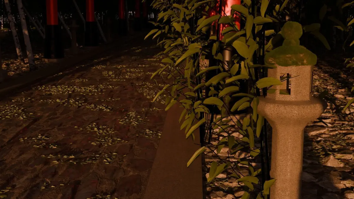 Beautiful work of a road with a Torii in a Japanese forest.