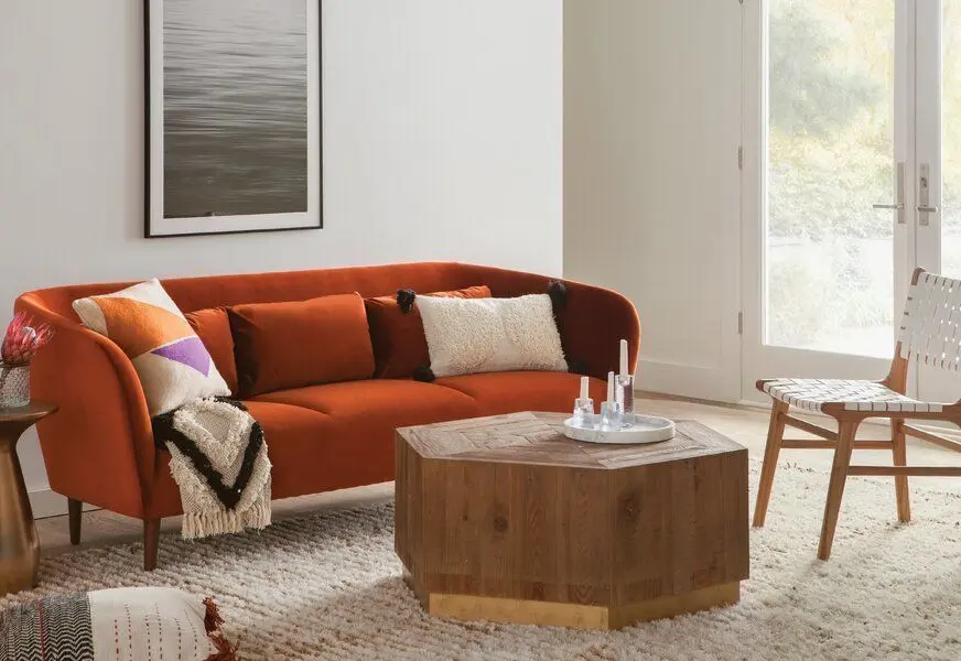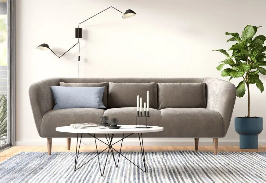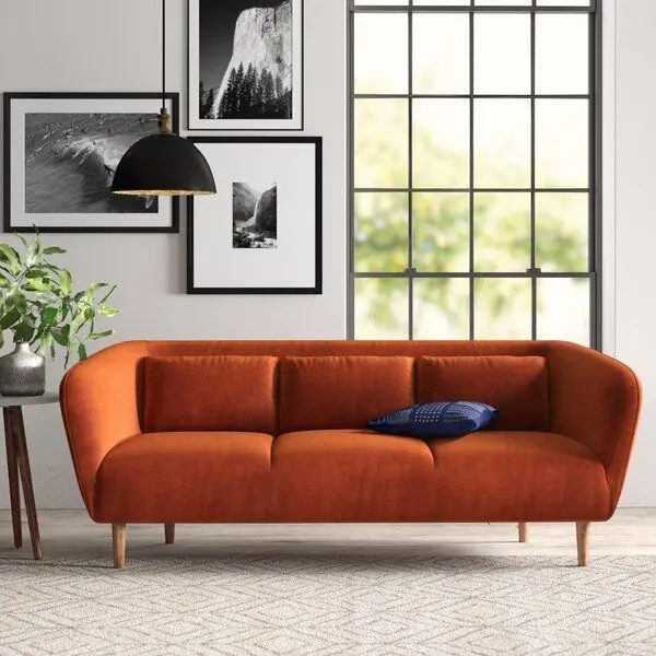 - Level up your living room with this modern sofa. The sloped back is connected to slim arms that flare at the sides, creating a stylish silhouette. With a tight seat and decorative stitching, this couch has modern style to spare. The solid New Zealand pine frame is upholstered in polyester-velvet for a soft and sturdy touch. The cushions are foam-filled and rest on supportive web suspension. Translation: It’s a super comfy seat. The tapered legs add to the overall modern aesthetic, making this sofa a sure win.