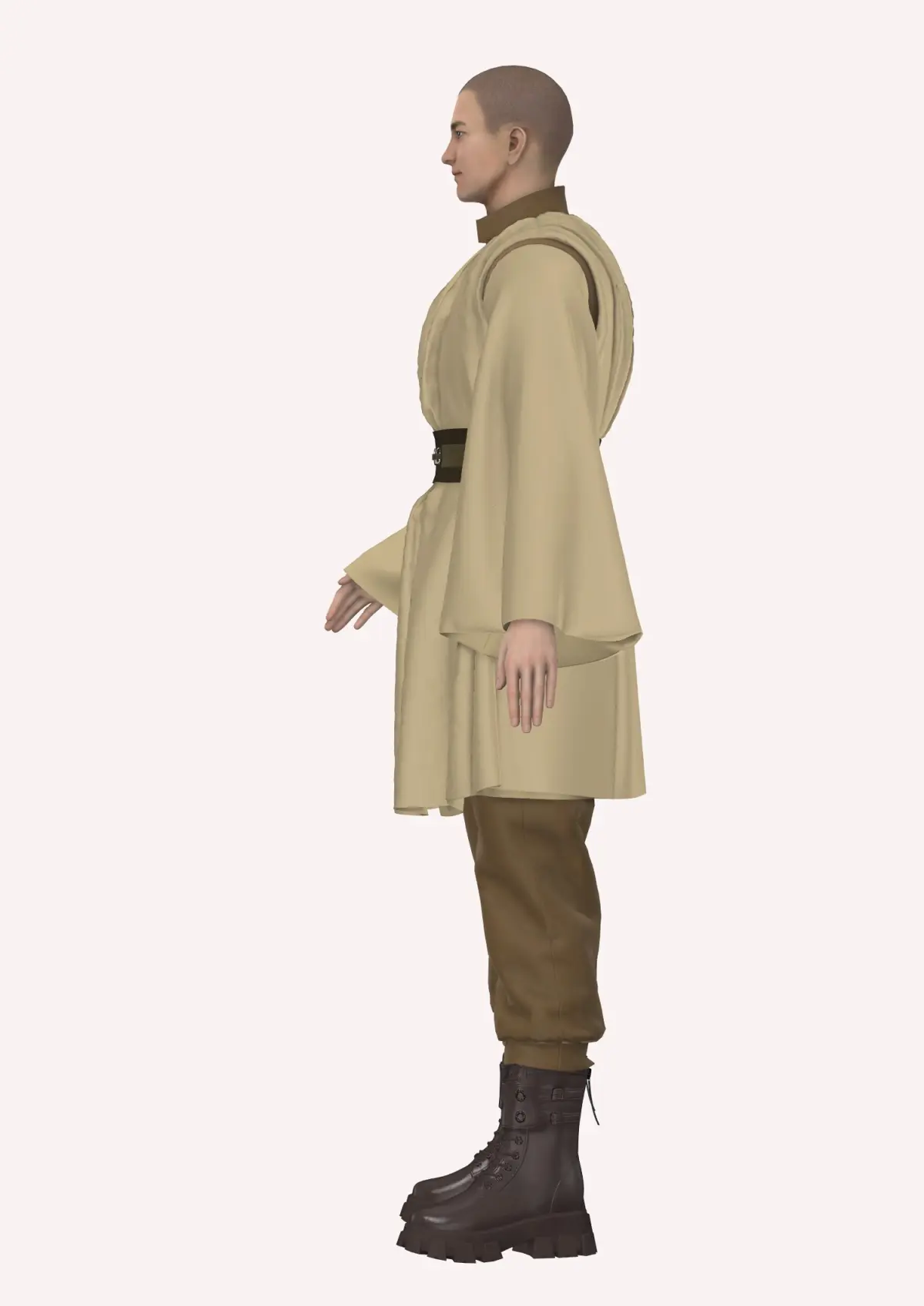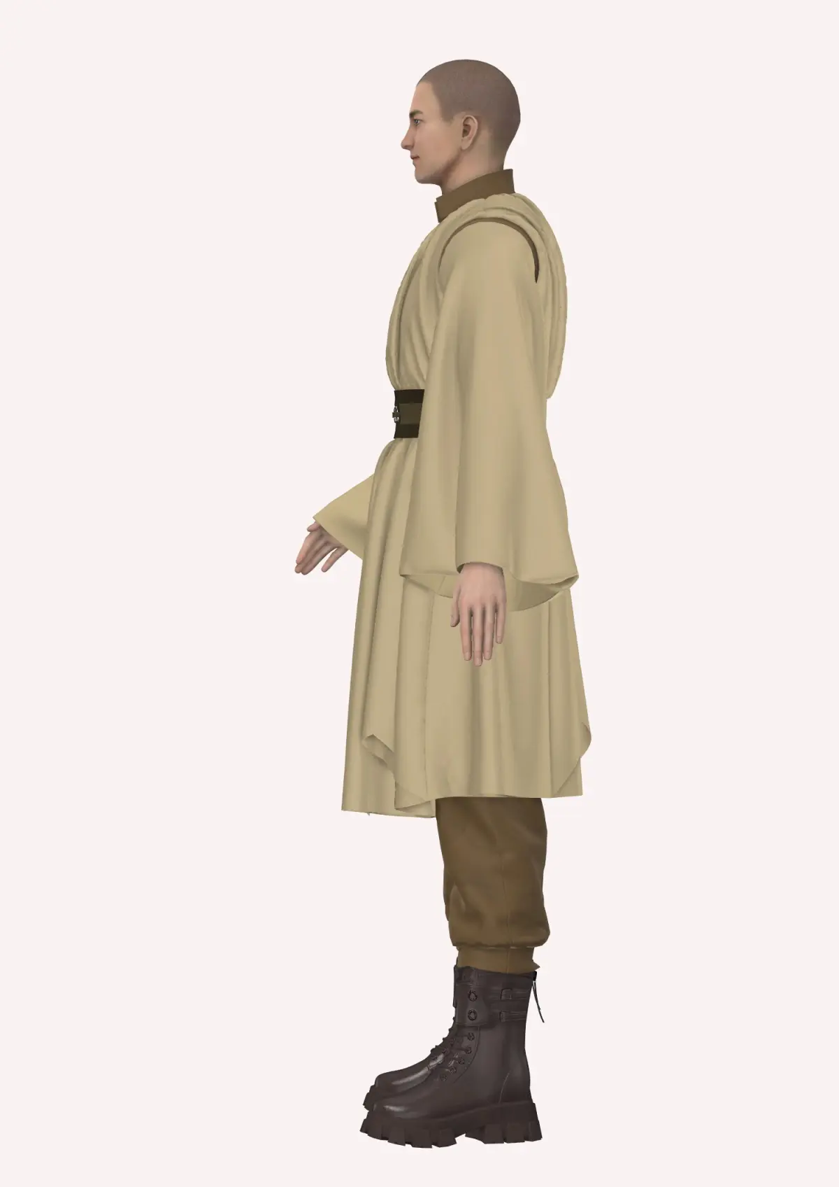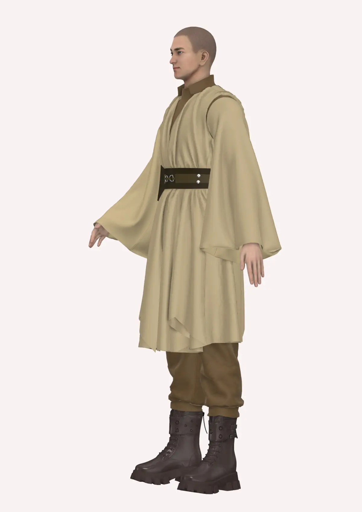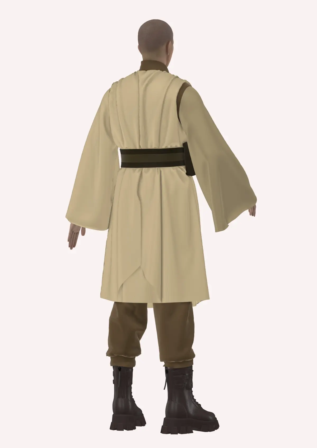 This Jedi inspired garment, created in Style3D Atelier, featurs a long, flowing robe in a neutral, beige color. The tuni styled robe has wide, draped sleeves, giving it a relaxed, yet authoritative appearance. Underneath, a dark brown jumpsuit, that has a top with flared, draped sleeves, peeks through, adding depth and contrast to the overall look. A wide, utility-style belt cinches the waist, adorned with metallic buckles and a pouch on the side for functional flair. The pants are tucked into chunky, tactical-style boots in a dark brown shade, providing a rugged and practical feel. The boots have a sturdy, military-inspired design, complementing the earthy tones of the ensemble. The overall aesthetic is practical yet mystical, blending simplicity with a sense of readiness for adventure.