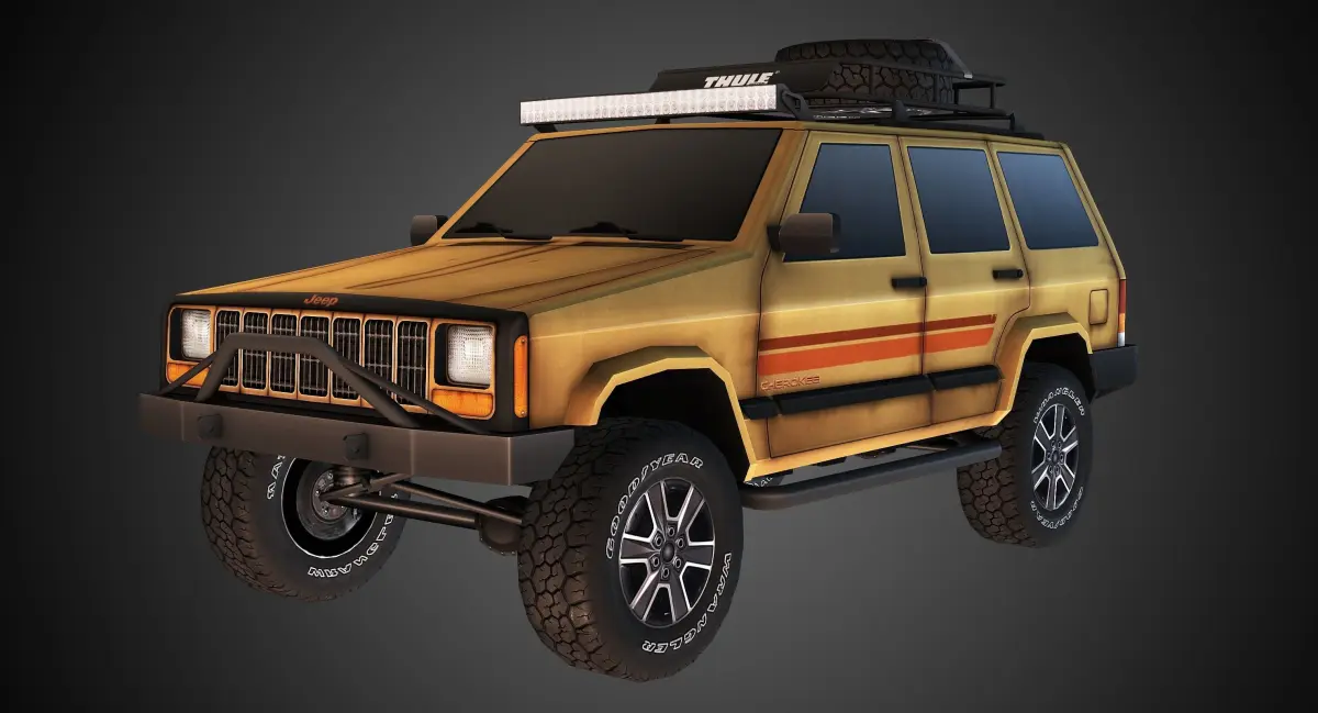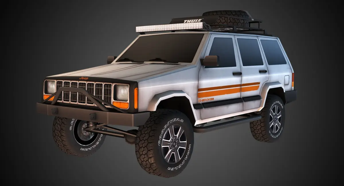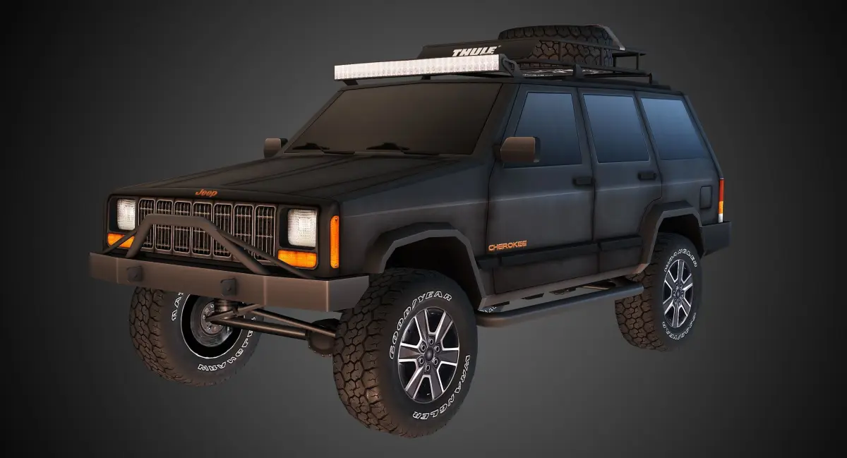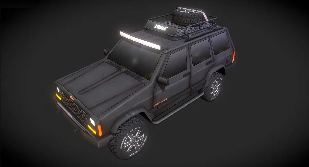 Low poly model of a Jeep Cherokee, jacked up and ready for off road adventures. Uses two 2048 x 2048 textures and a few smaller maps for the logos.