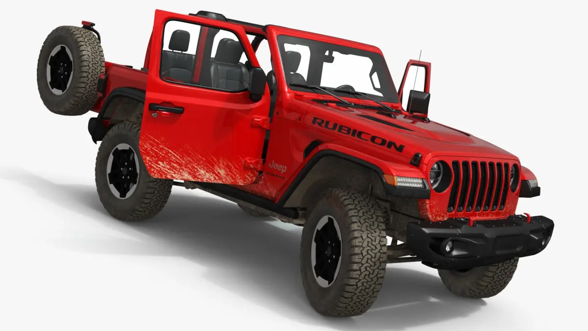 Jeep Wrangler Rock Climbing Vehicle Red Dirty Rigged for Cinema 4D is a three-dimensional model of compact mid-size off-road four-wheel drive SUV automobile (Jeep Wrangler Rubicon), that is a rugged utility vehicle designed for versatile terrain use.