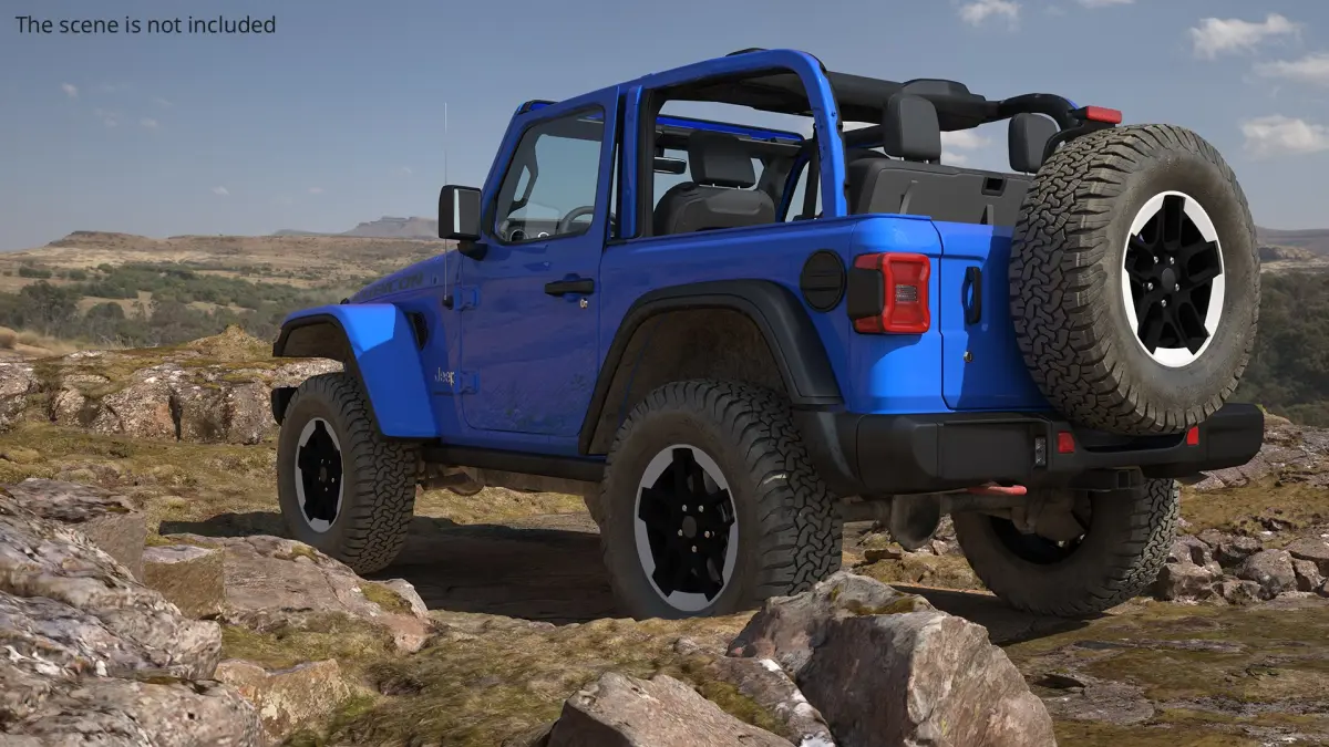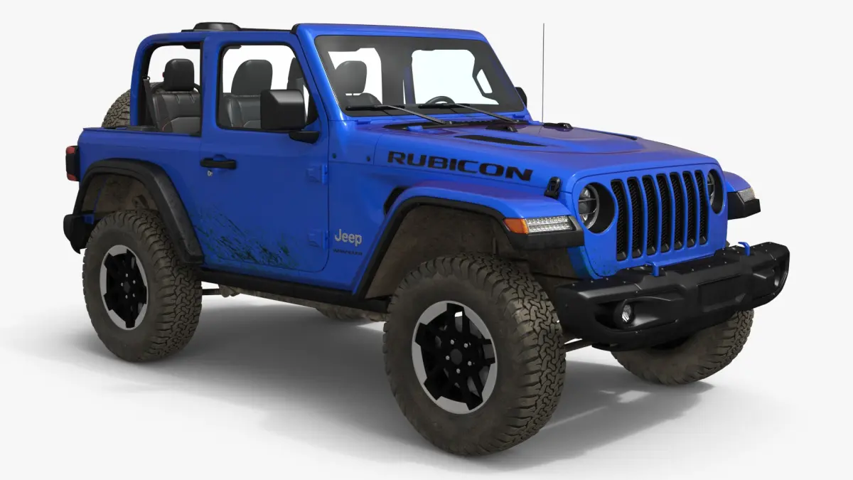 Jeep Wrangler Rubicon Open Top SUV Blue Dirty is a three-dimensional model of compact mid-size off-road four-wheel drive SUV automobile that is a rugged utility vehicle designed for versatile terrain use.