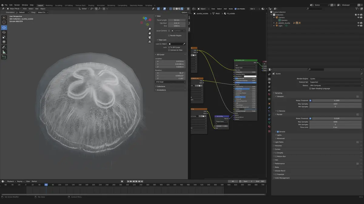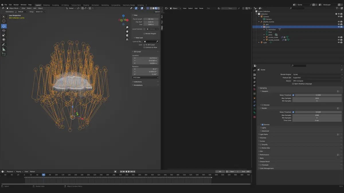 The Jellyfish Aurelia. There are Blender and Maya Projects. The Jellyfish has a animation loop 585 frames. It has 2 materials with 2K textures (Albedo, Metallic, Normal). The jellyfish was made in autodesk maya version 2020.