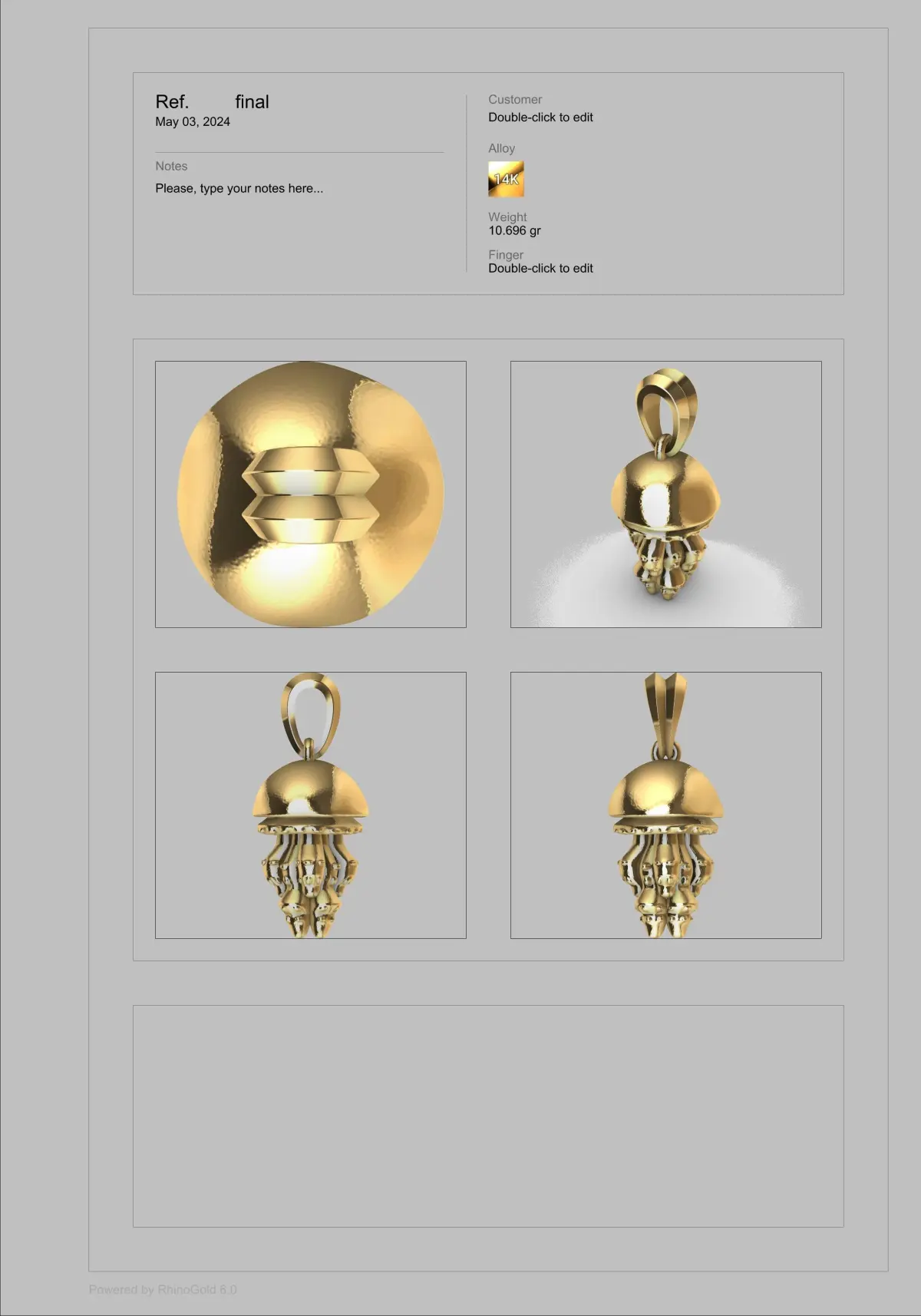 Jellyfish Pendant Necklace Charm Bracelet JewelryAll dimensions and weight for the pendant are in the pictures. This model was created in Zbrush and has a polygonal geometry. The model's geometry is mesh-based and is not in Rhinoceros Nurbs format. It was imported into a Rhino 3dm file. It is created for 3D printing and is ready for 3D printing production. Please check the pictures for more information.