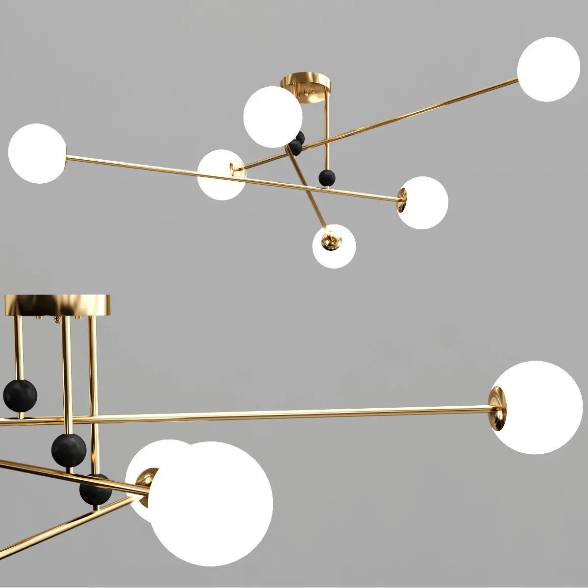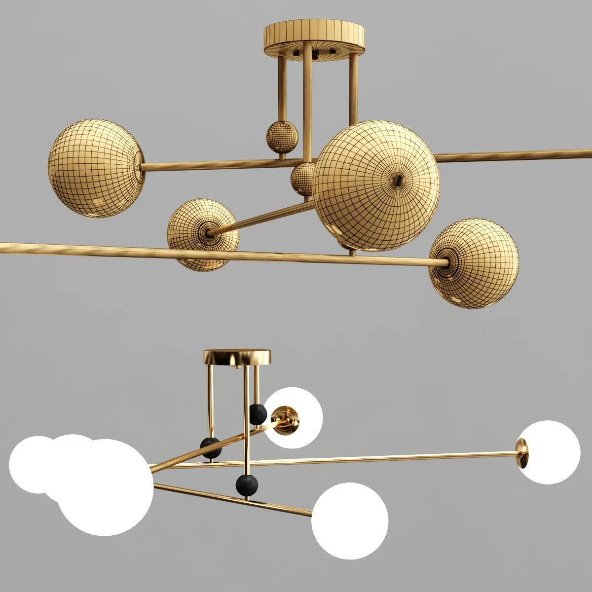 Designer chandelier with glass shades on rods