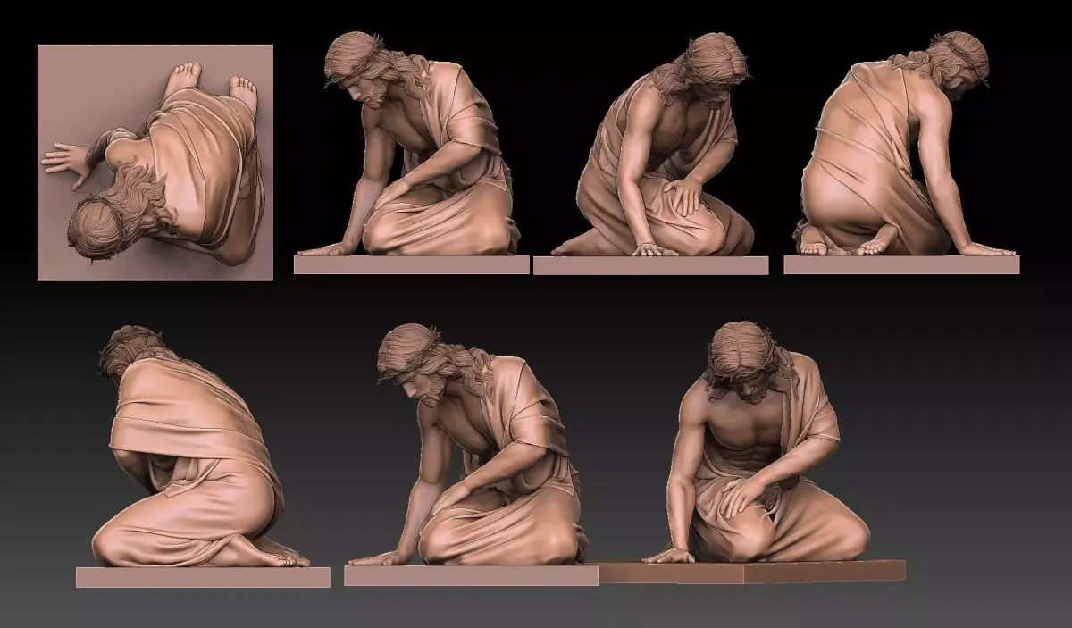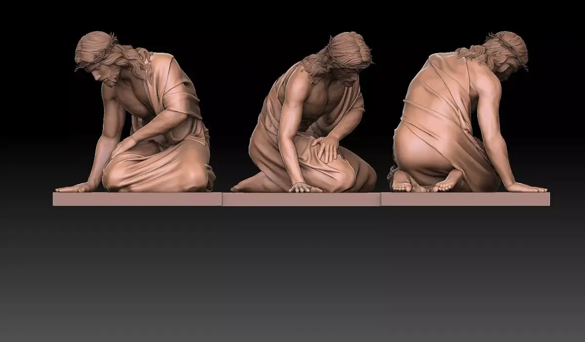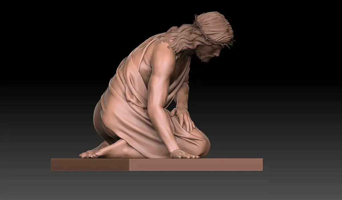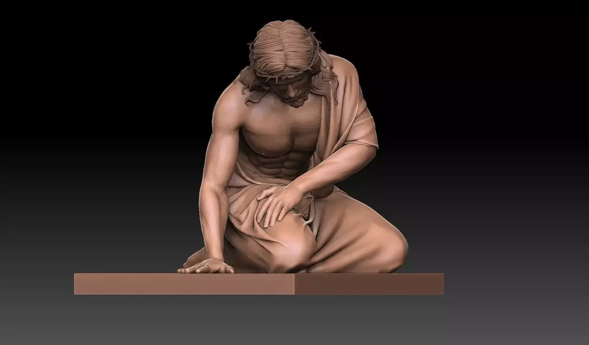 Highly detailed 3D model of Jesus Christ in a moment of profound suffering, depicted kneeling and collapsed forward under the weight of his burden. His body shows anatomical realism and muscular tension, crowned with thorns, draped in flowing fabric that accentuates his posture of exhaustion and sorrow. The sculptural depth and emotional intensity make this ideal for CNC carving, 3D printing, or engraving — perfect for church altars, religious icons, memorial art, or devotional displays. Includes base for stable mounting.