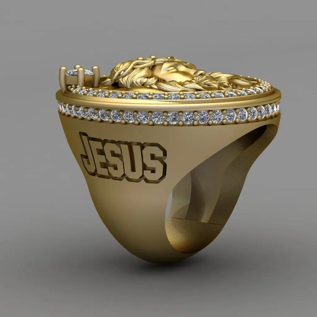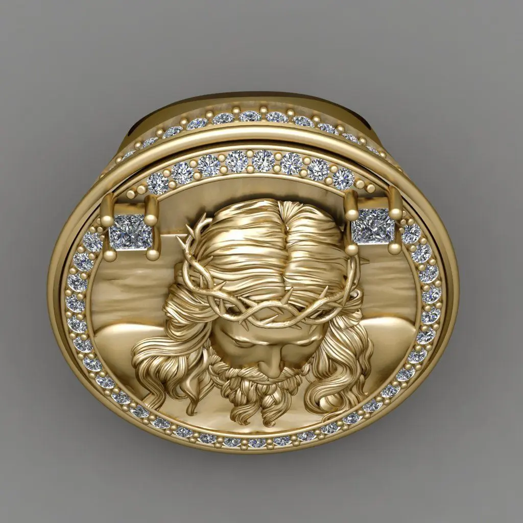 The design of the ring is both elegant and powerful. Diamonds are meticulously set around the image of Jesus, creating a radiant halo of light and brilliance. Each diamond represents the purity and eternal nature of Christ's love and grace. The band of the ring may feature ornate patterns or symbols that hold special significance in connection to Jesus and His teachings.