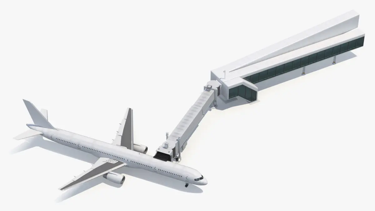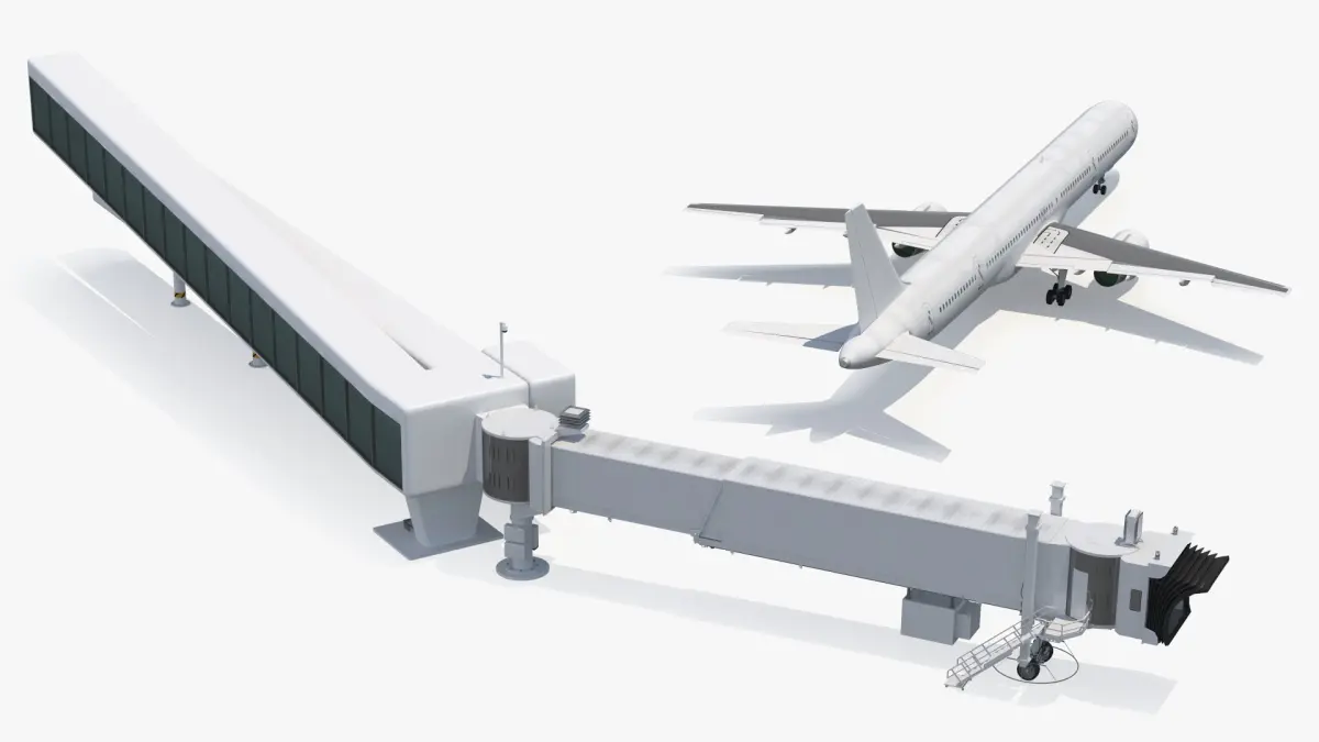 The model features a highly detailed passenger jet docked at a realistic jet bridge, showcasing architectural terminal elements, glass corridors, docking mechanisms, and aircraft features such as wings, engines, and landing gear. This design emphasizes authenticity in both aviation infrastructure and aircraft integration, making it ideal for realistic airport visualizations.