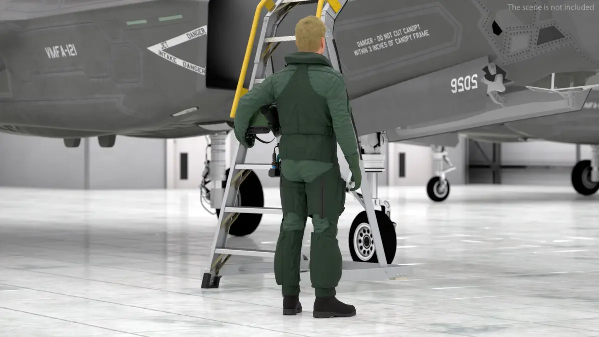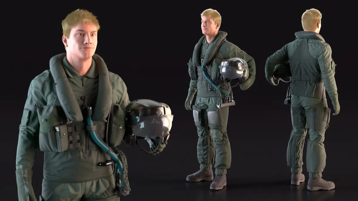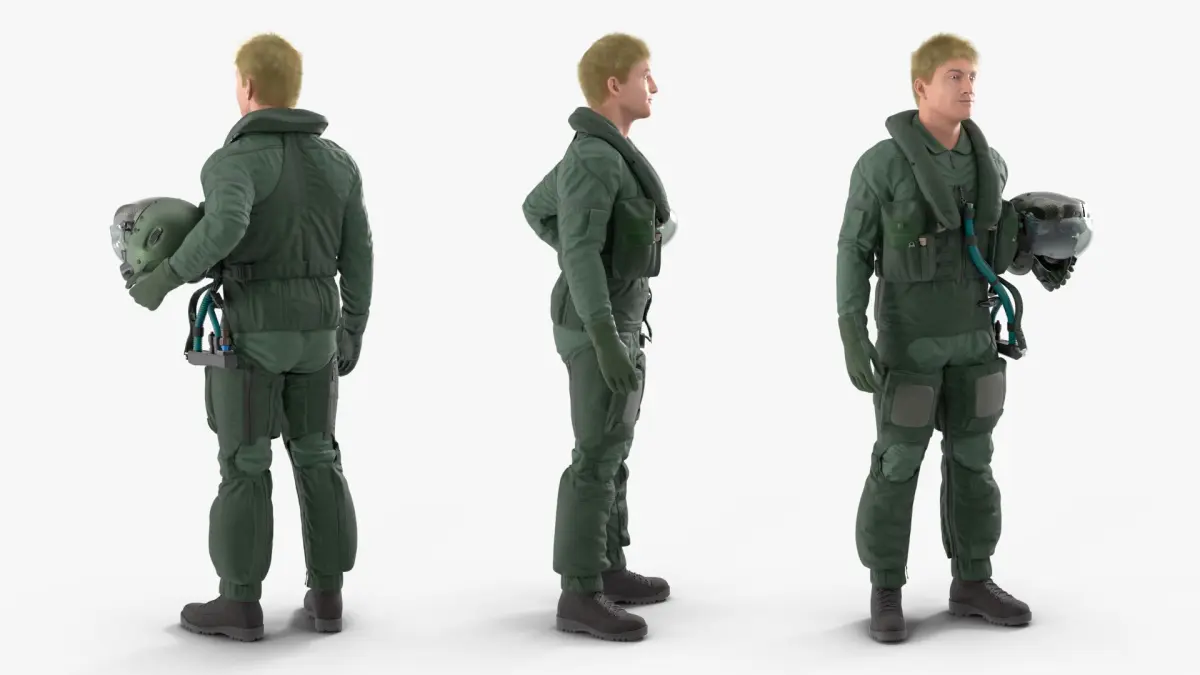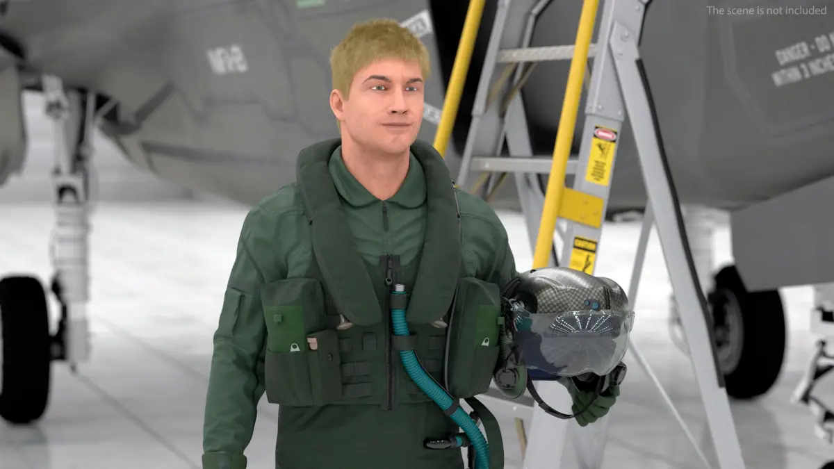 Jet Fighter Pilot with Helmet in Hand Fur is a 3d model of a jet fighter pilot, designed in full uniform with a helmet held in hand.
