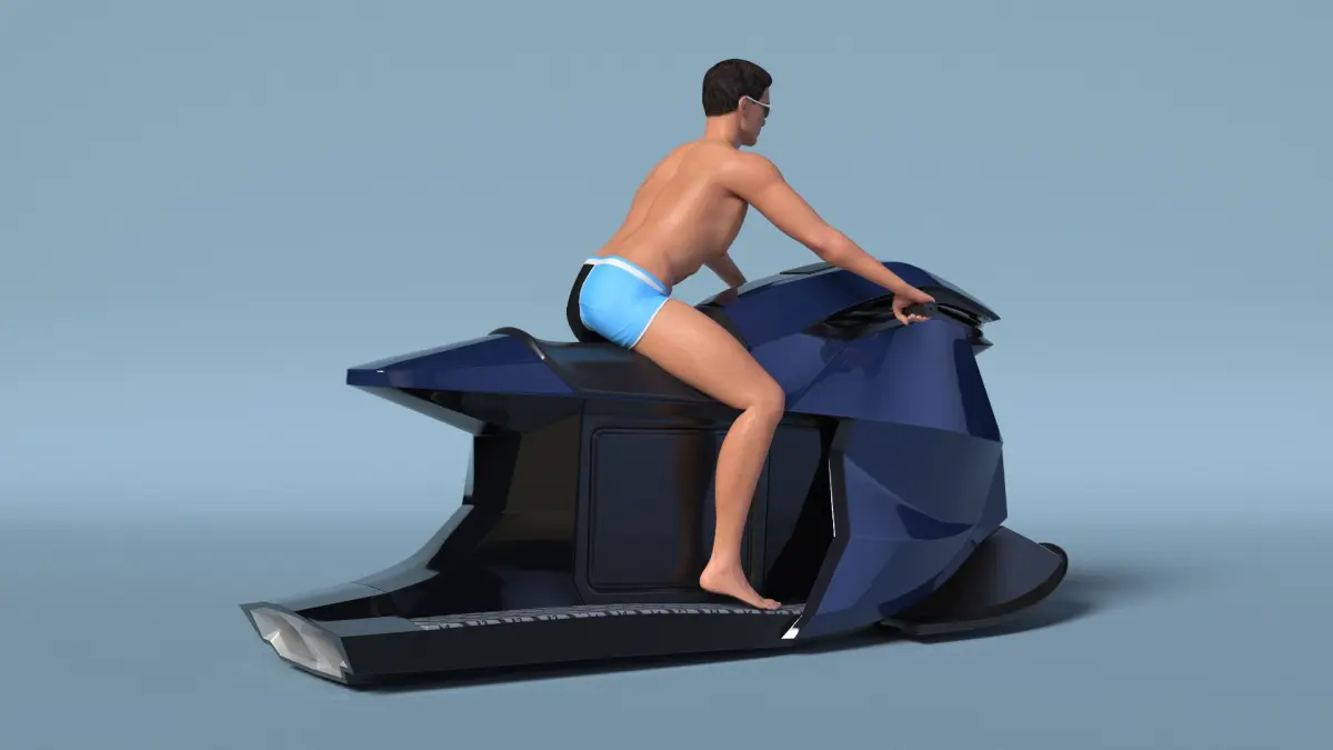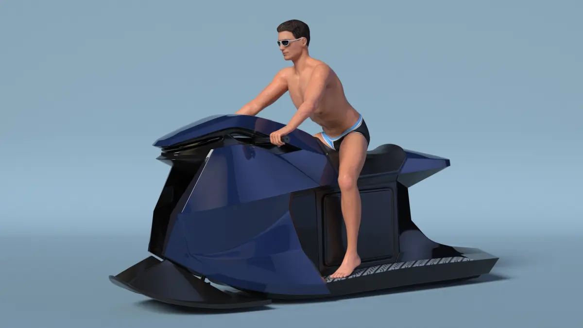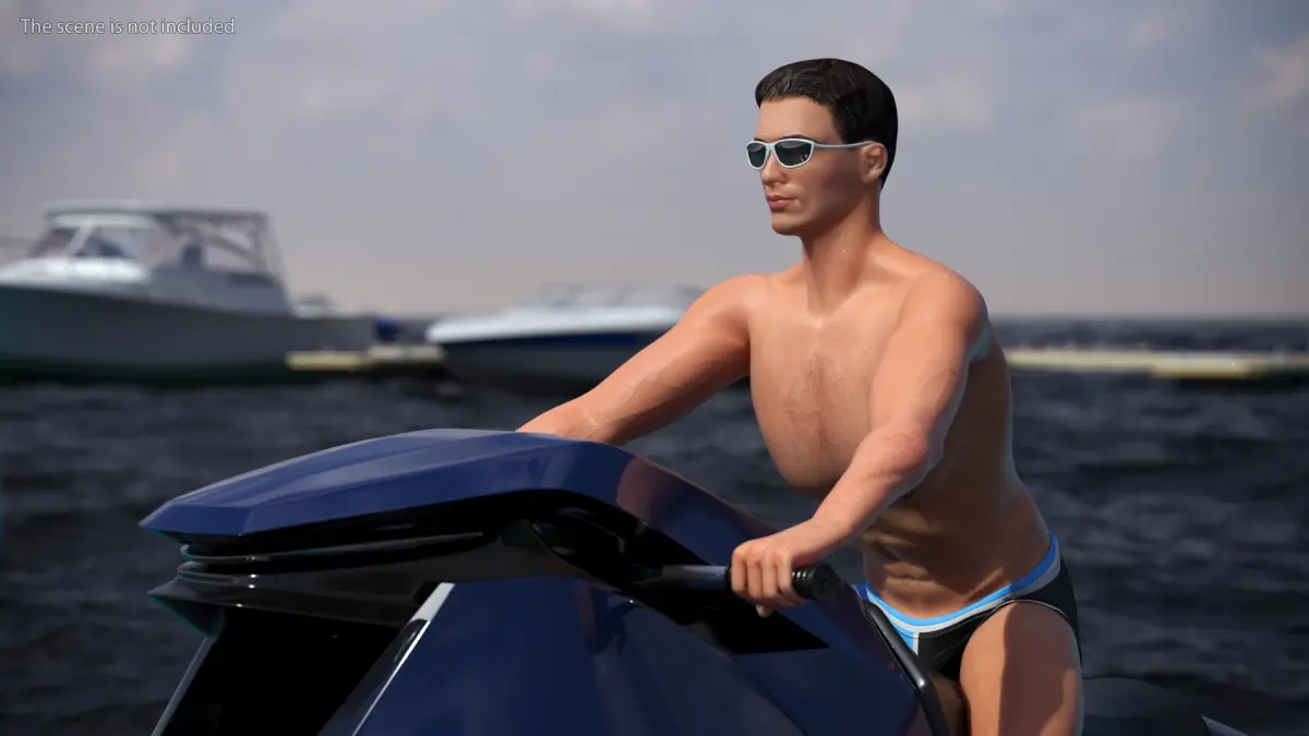 This model features a detailed design of a jet ski with a rider in a dynamic pose. The jet ski showcases a contemporary structure with smooth lines and a polished finish. The rider is depicted wearing minimal attire and sunglasses, adding to the casual and adventurous vibe. The model captures the essence of speed and agility often associated with water sports.