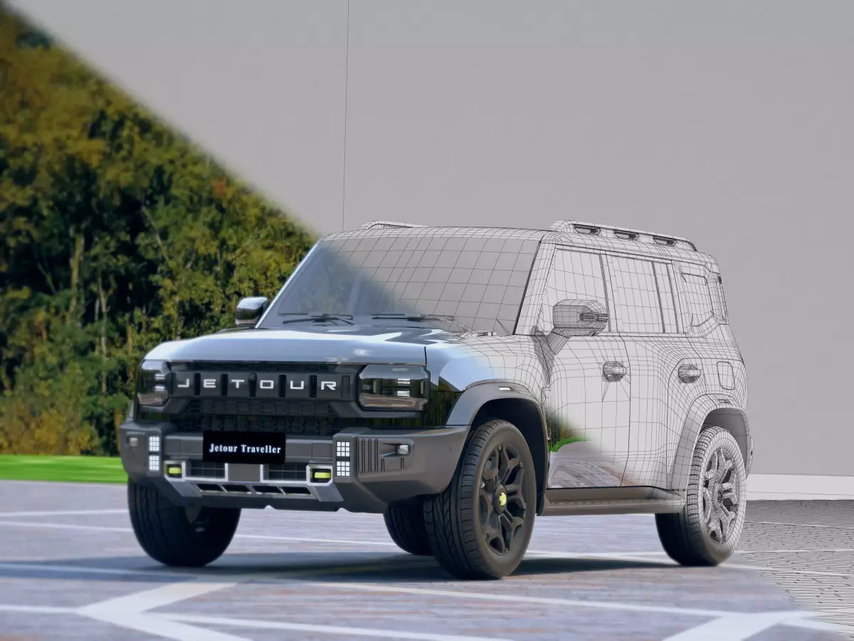 Jetour Traveler is a mid size SUV under Chery Automobile, positioned as a travel off-road SUV. The body size is 4785 × 2006 × 1880mm, with a wheelbase of 2800mm. The car is built on the Kunlun architecture and offers multiple power options such as 1.5T, 2.0T fuel version, and C-DM plug-in hybrid version, and is equipped with the XWD fully automatic intelligent four-wheel drive system. The vehicle was launched in 2023 and has sold over 10000 units for several consecutive months, leading the square box SUV segment market multiple times. It has a 28 ° approach angle, 30 ° departure angle, and 700mm wading depth, with a rugged design and intelligent technology configuration. Model making software: 3ds Max 2014 Rendering software: vray3.60.03 for 3dmax2014