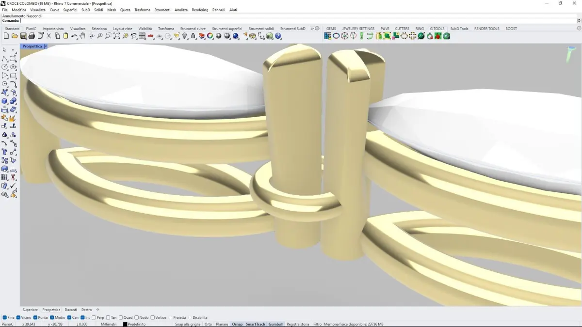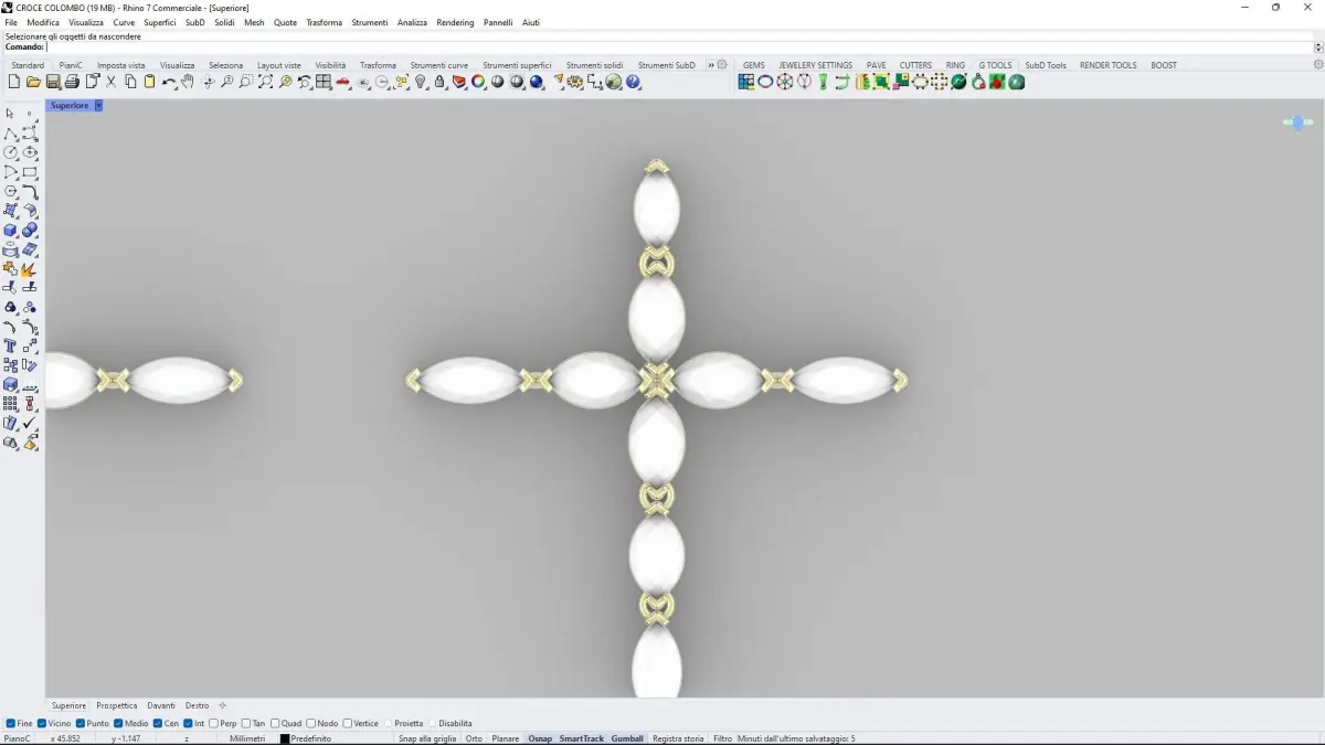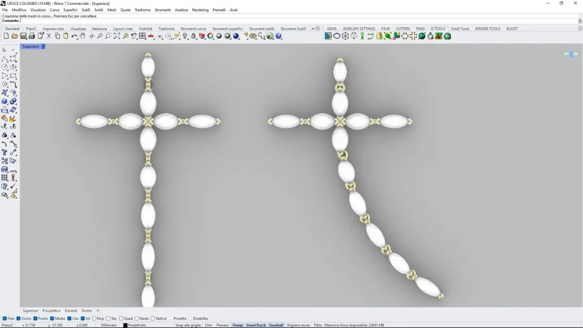 Gold cross pendant designed for shuttle cut stones, in the project there are two crosses, one definitive, the other with the posts already positioned for printing and casting, so as to be perfect.