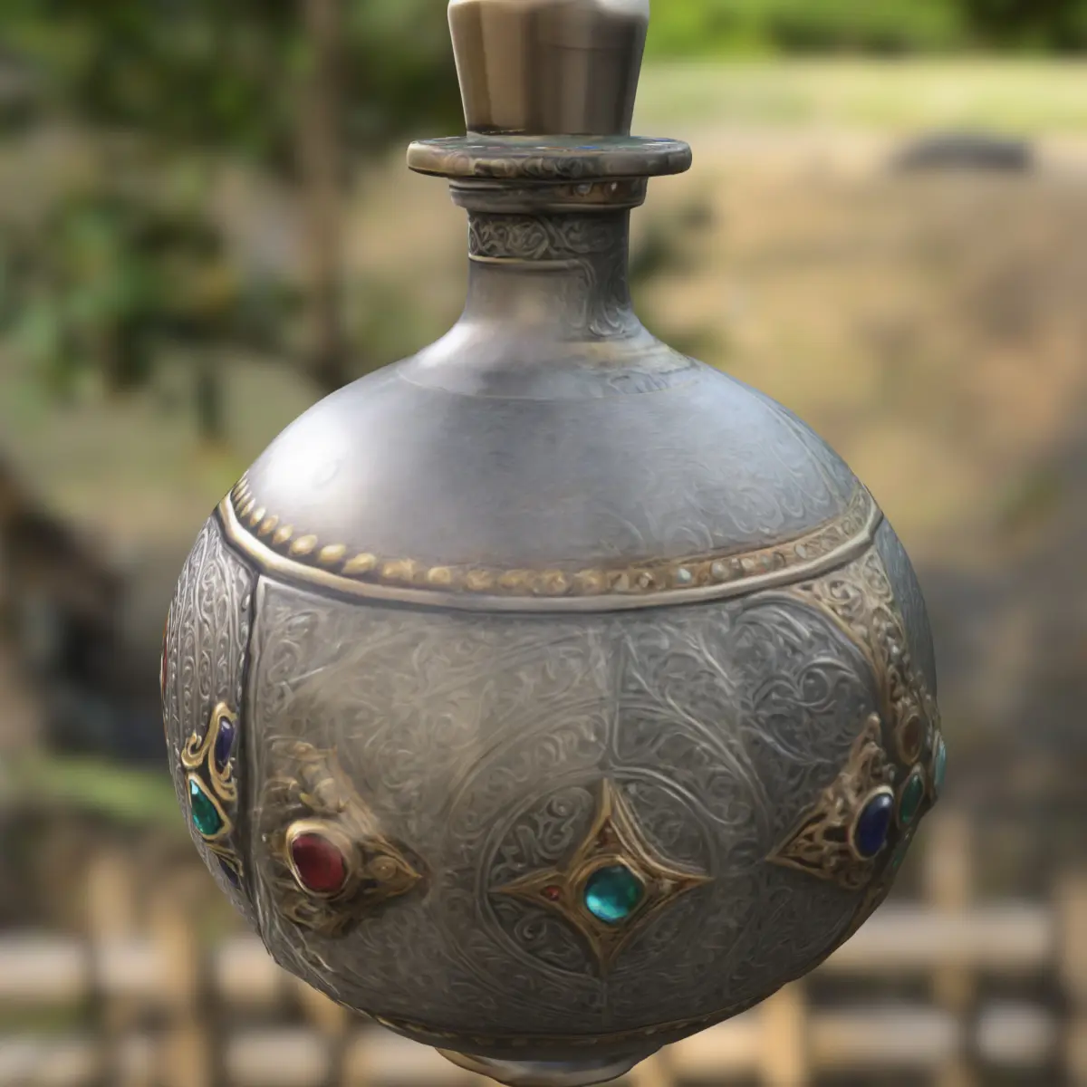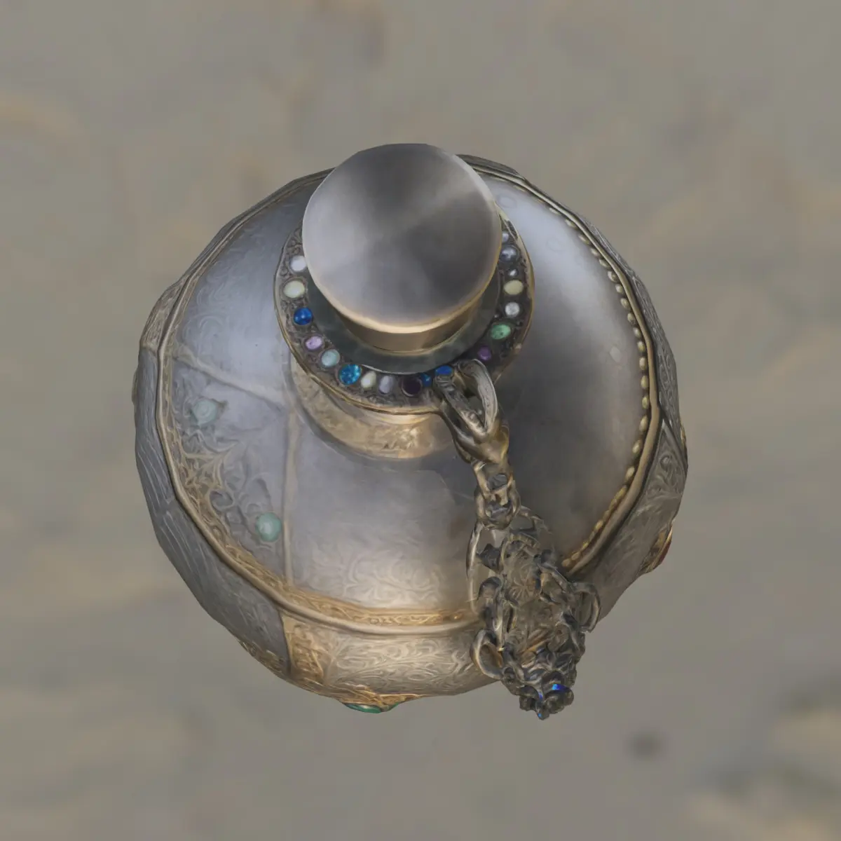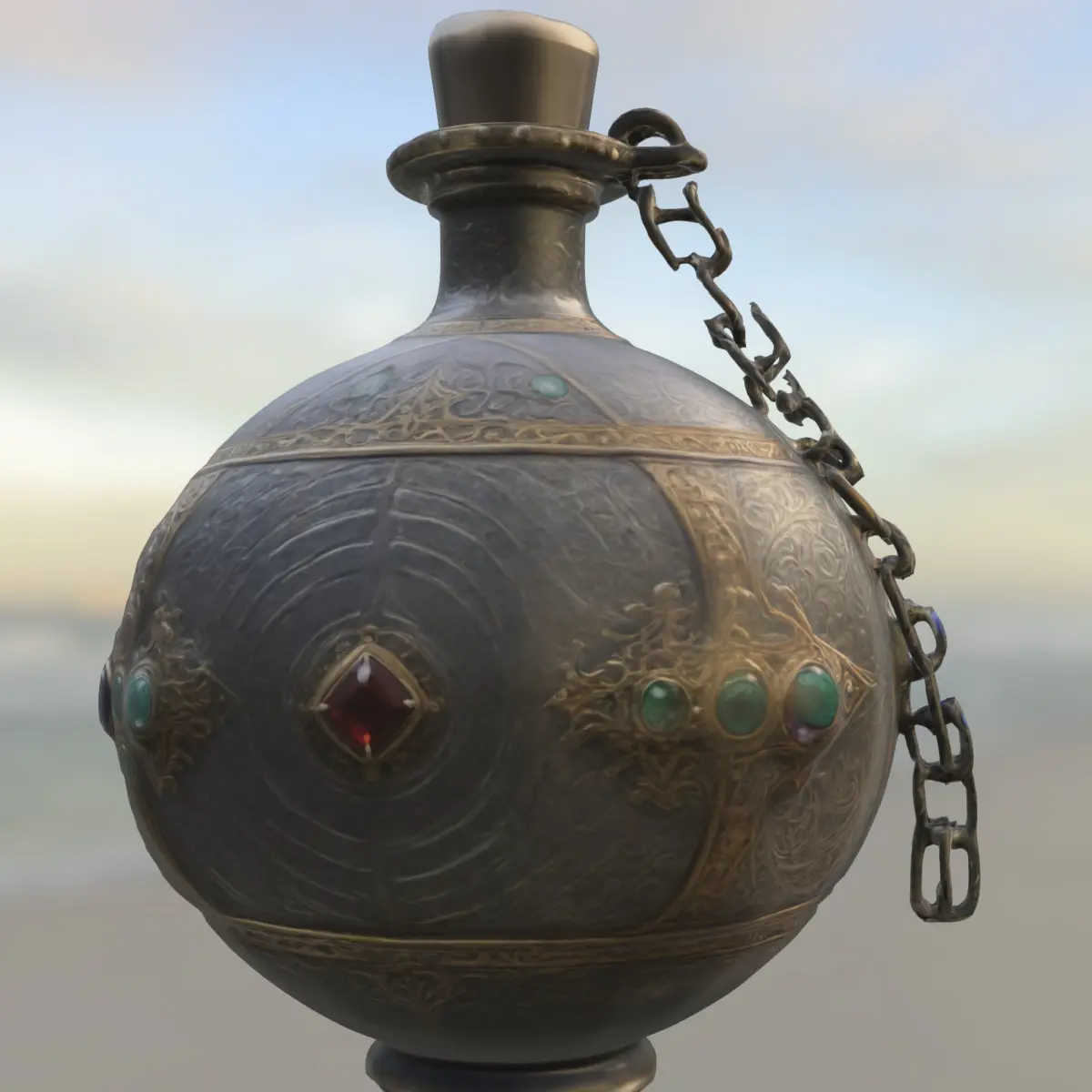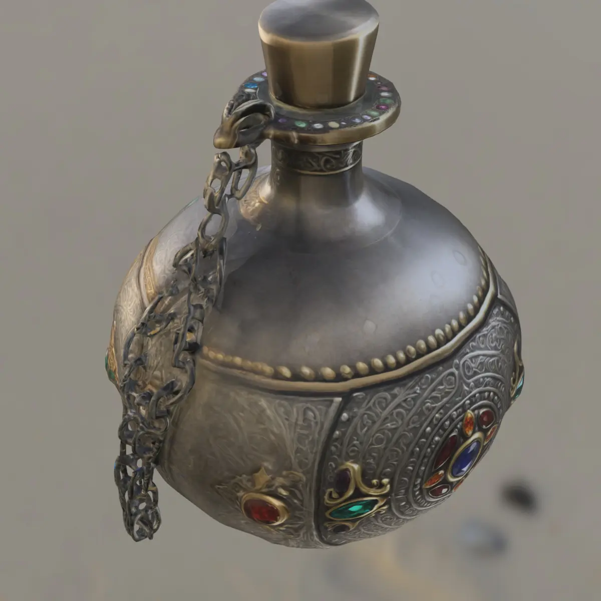 The Jeweled Arcane Flask is a highly detailed 3D model of a mystical potion container, adorned with intricate engravings, ornamental filigree, and colorful gemstones. This asset is perfect as a magical item, quest artifact, alchemical ingredient, or inventory collectible in fantasy and RPG-style games.