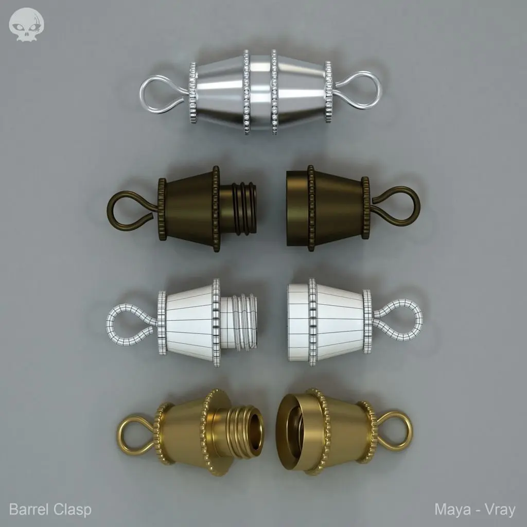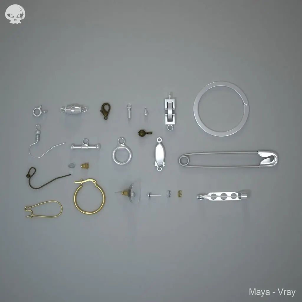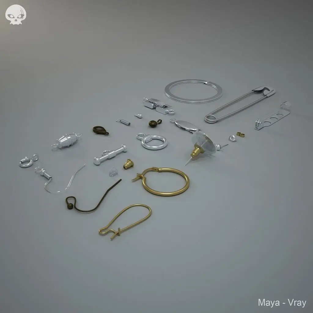 Bolt ring (Poly count: 1790)Lobster claw clasp (Poly count: 818)End decoration (Poly count: 124)Key ring (Poly count: 352)Barrel Clasp (Poly count: 2869)Chain end and jump ring (Poly count: 378)Fold over clasp (Poly count: 1116)Earring hook B (Poly count: 1242 )Toggle Clasp (Poly count: 448 )Earring hooks (Poly count: 880 )Ball end (Poly count: 524 )Fish hook clasp (Poly count: 1436 )Safety pin (Poly count: 966 )Brooch back (Poly count: 940) Ear stoppers (Poly count: 372)Hinged Hoop (Poly count: 780 )Ear stud (Poly count: 730 )Earring flat plate (Poly count: 1714 )