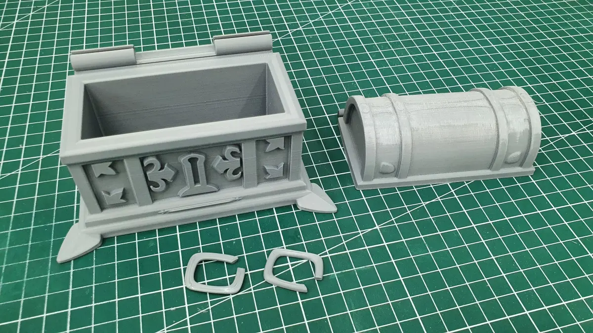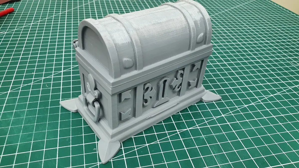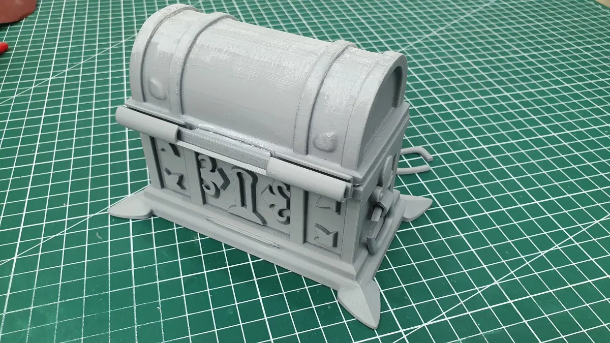 İnner volume is 9cm x 4cm x 4cm in chest part and 9cm x 3cm radius half cylinder for lid part. Of course you can rescale it any size you want but hinge parts can cause difficulties in large amount of size changes.