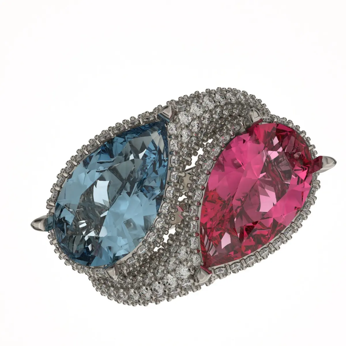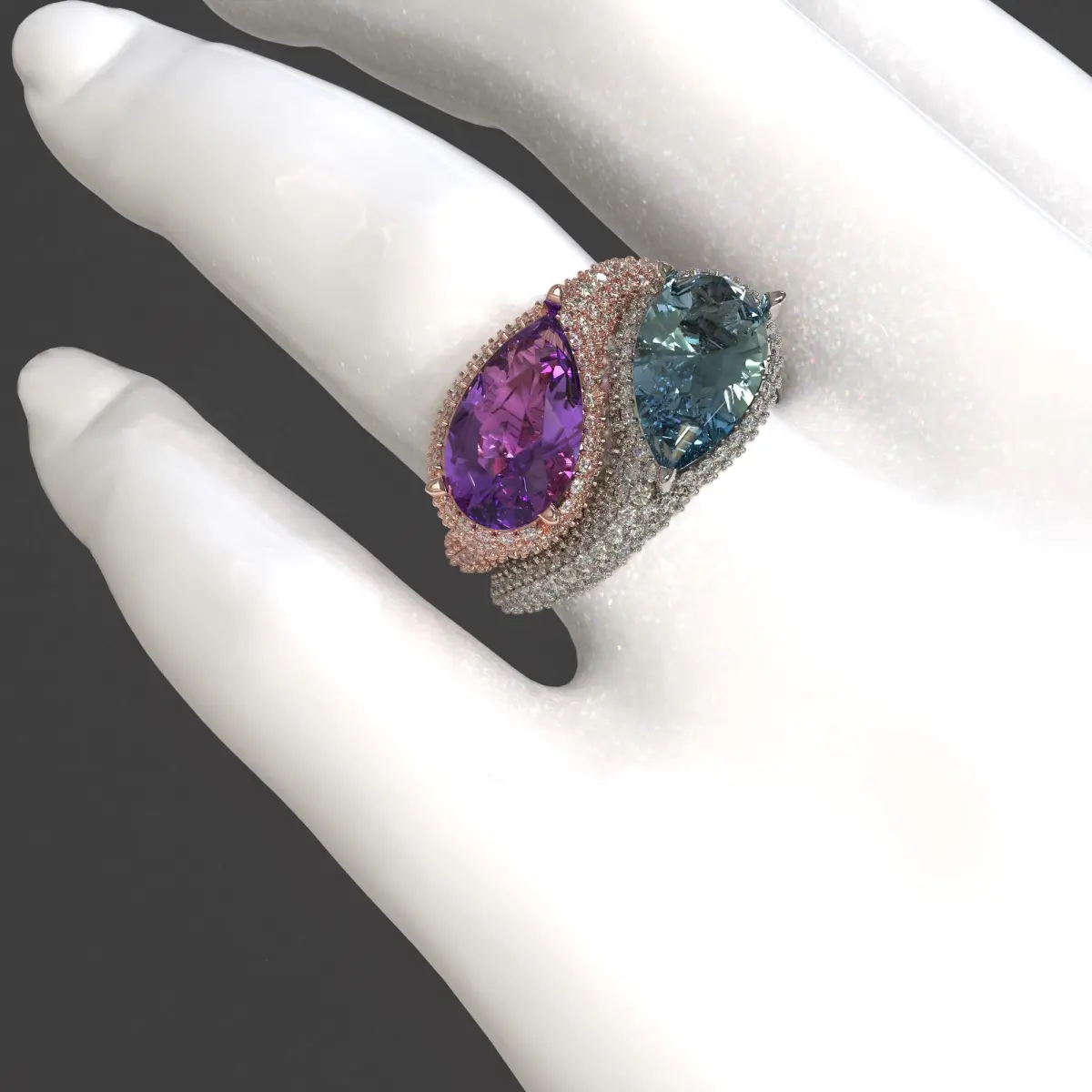 One ring has gems: pear 12.0x7.0mm-1 piece,gem weight-2,17ct. round 1.0mm-231 pieces,gems weight-0,91ct.