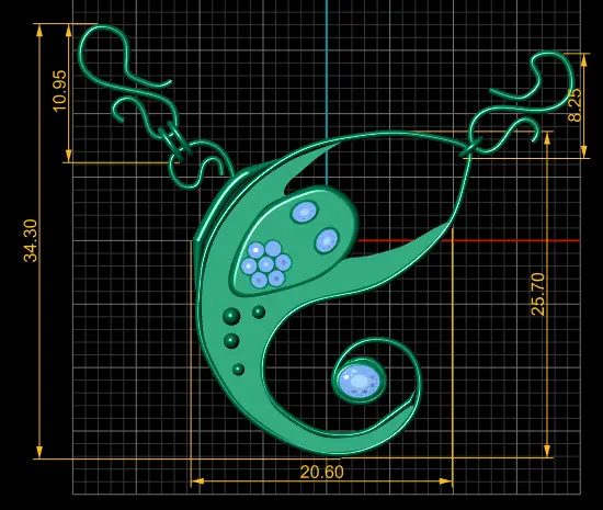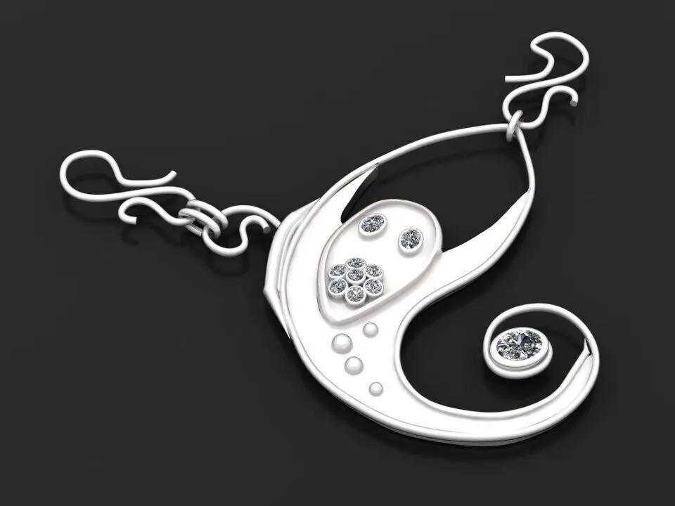 This unique 3D pendant model features an abstract, artistic design that blends fluid curves with a playful yet elegant character. The gold-polished body forms an organic, flowing shape reminiscent of a crescent moon or a stylized wave. Delicate diamond settings enhance the face and tail area, adding brilliant sparkle and luxurious detail. The open framework design ensures a lightweight, airy aesthetic while maintaining a strong visual impact. Perfect for contemporary jewelry collections, custom 3D printing, or high-end artistic jewelry presentation