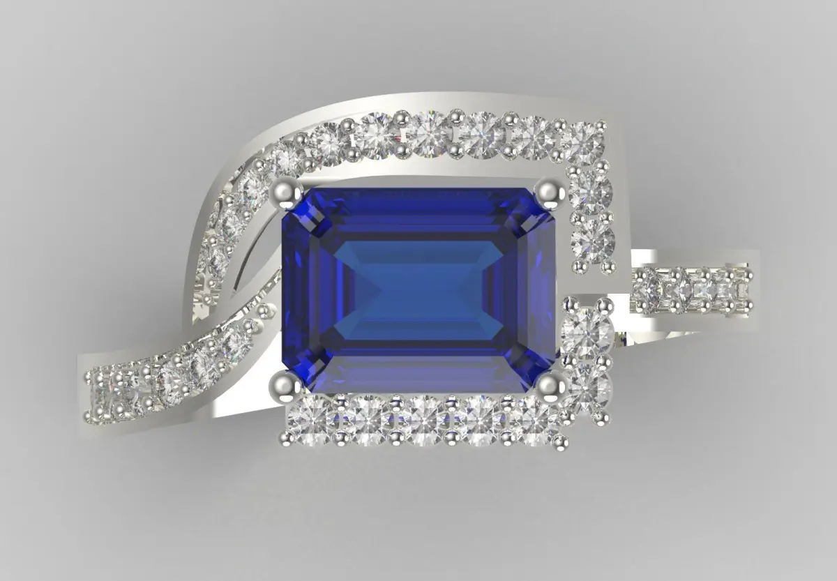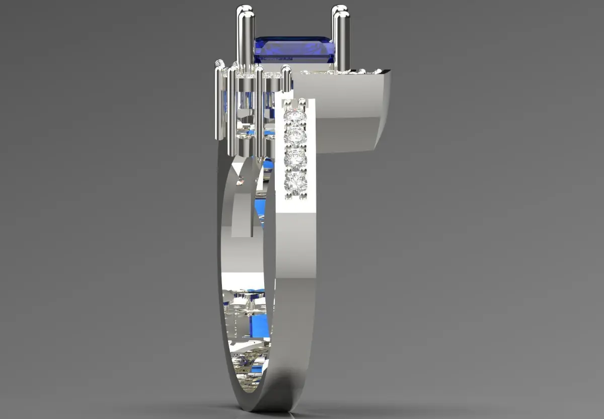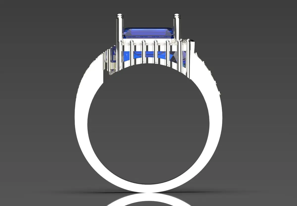 - Main Gem: A large emerald cut dark blue sapphire serves as the center stone of the ring. The deep blue color of the sapphire creates a beautiful contrast with the sparkle of the diamonds.