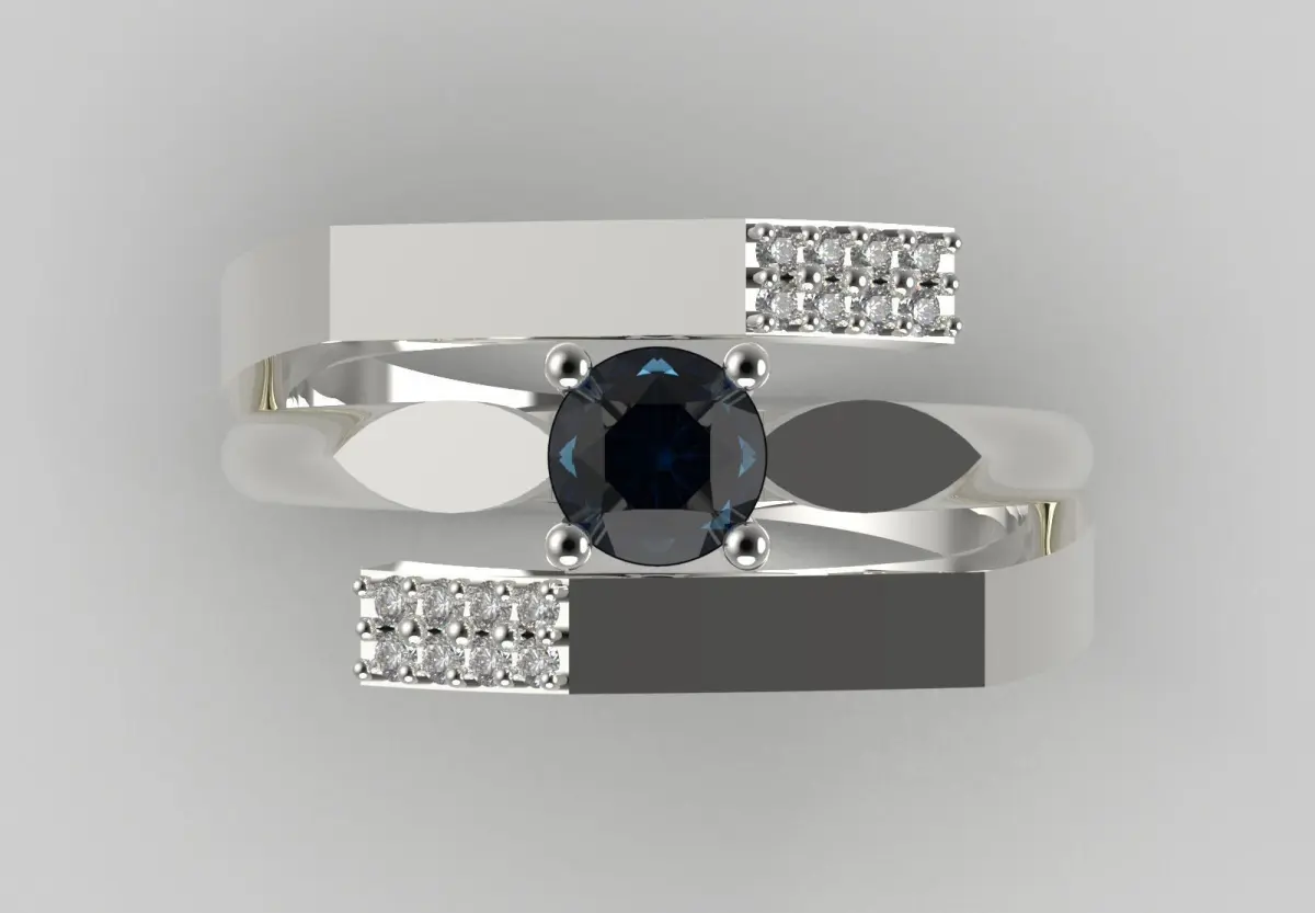- Large Round Diamond: A central round brilliant cut diamond that serves as the main focal point of the ring. The distinctive blue color of this gem (likely a light blue sapphire or a blue dyed diamond) gives it a unique look.