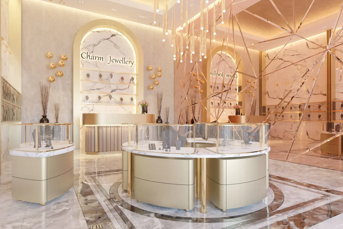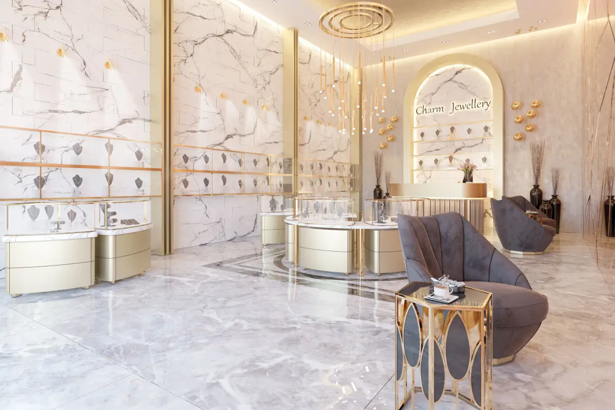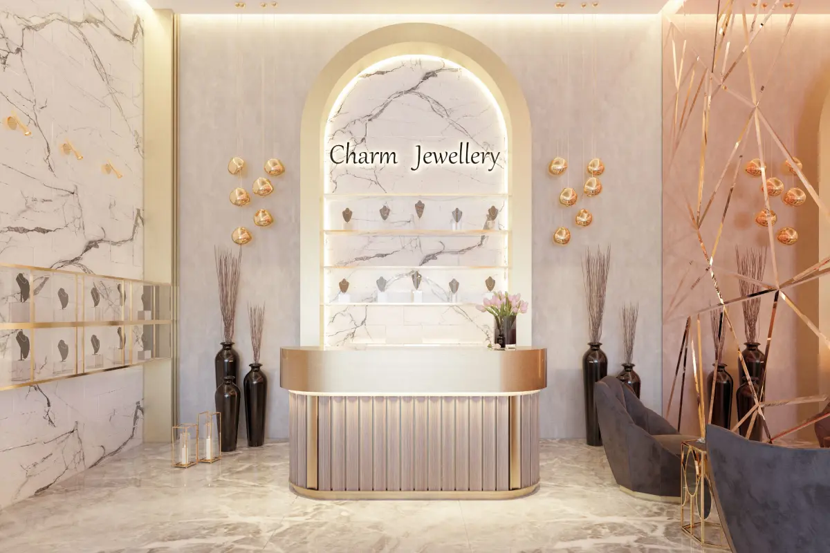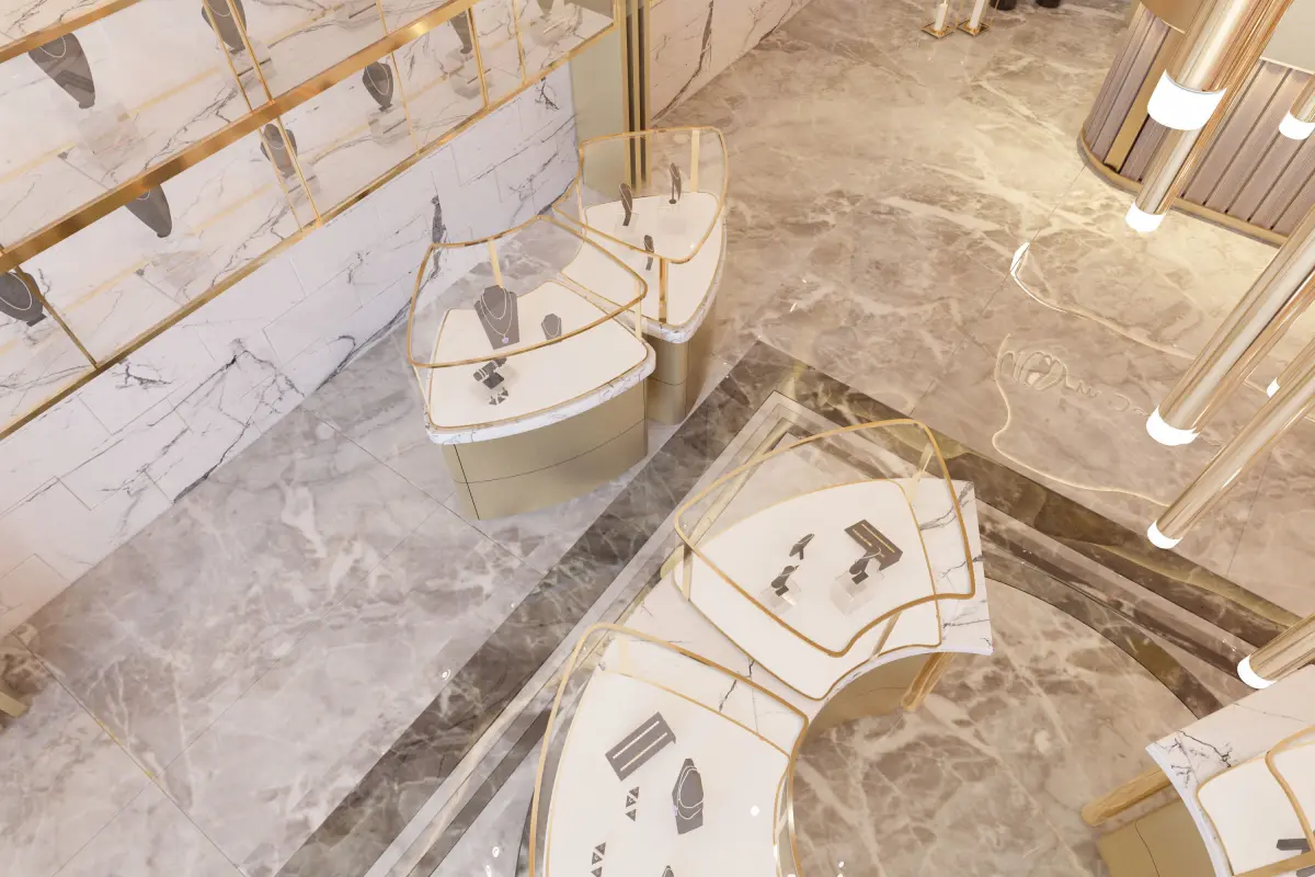 Geometric lines are prominent in the project, which is designed as a luxury jewelry shop. Mirrors and armchairs are designed in accordance with the concept. A spacious shop concept with sharp lines and high ceiling is aimed.