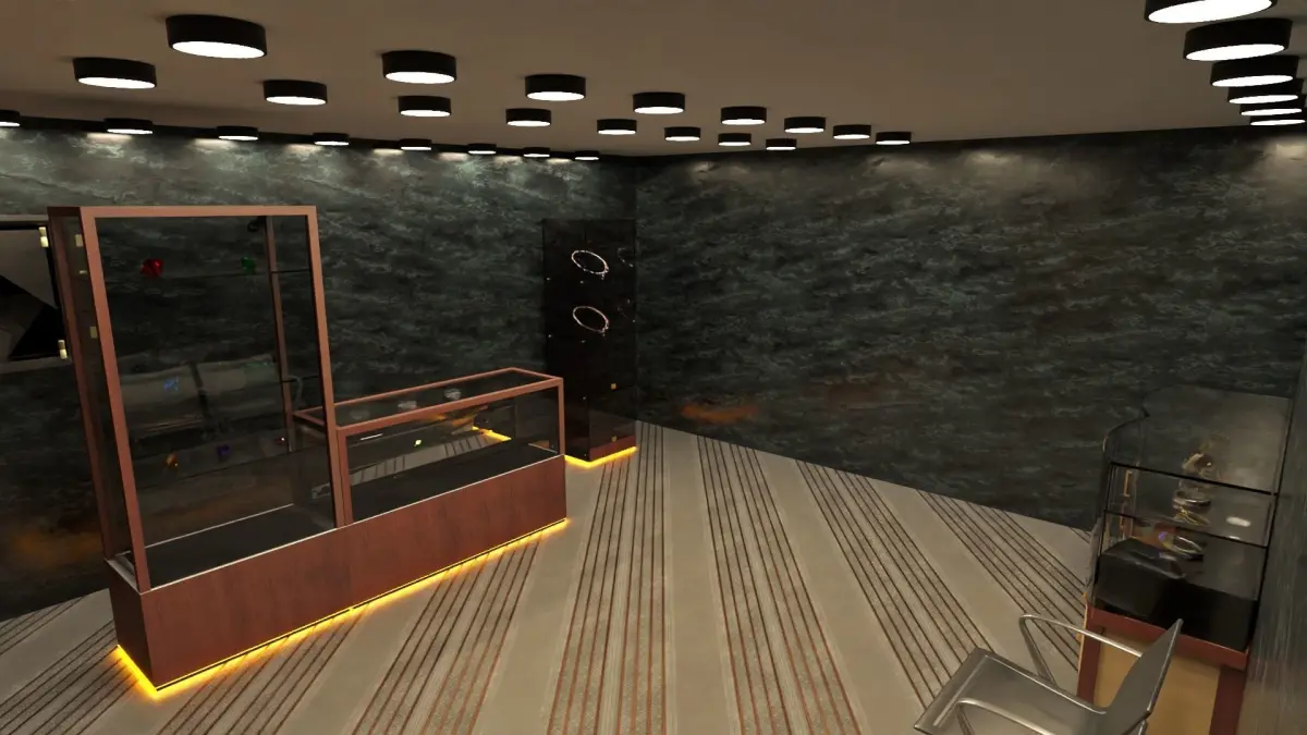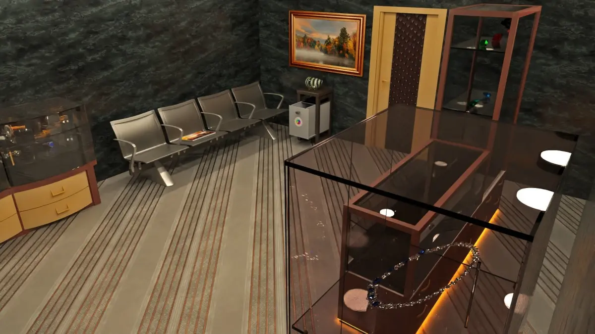 Jewelry retail shop with modern contemporary classic look, interior, façade modeled in Blender , rendered in Cycles textures are attached, FBX available included all textures, cameras and vray lights display case, showcase, wall hung, circular, wood floor, painting bar chair, island wall light, pendant lamp, chandelier bracelets, cuffs gold rings, earrings, crystal necklace, necklaces, pearl busts, mannequin, labels, ornate