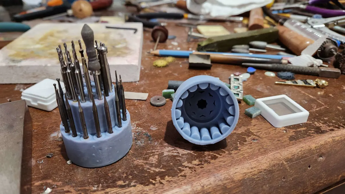 Designed to fit standard sized jewelry bits, heavy and stable enough to not topple over easily but also hollow bottom to save on resin. Holes have a diameter of 2.6mm, standard bits are around 2.33mm. Have printed on Elegoo mars 3 pro with around 15 heavy supports and the rest light supports with standard grey resin. Designed in Rhino, uploaded as STL and 3dm. Included is a Chitubox supported version, results may vary on printer and resin type.
