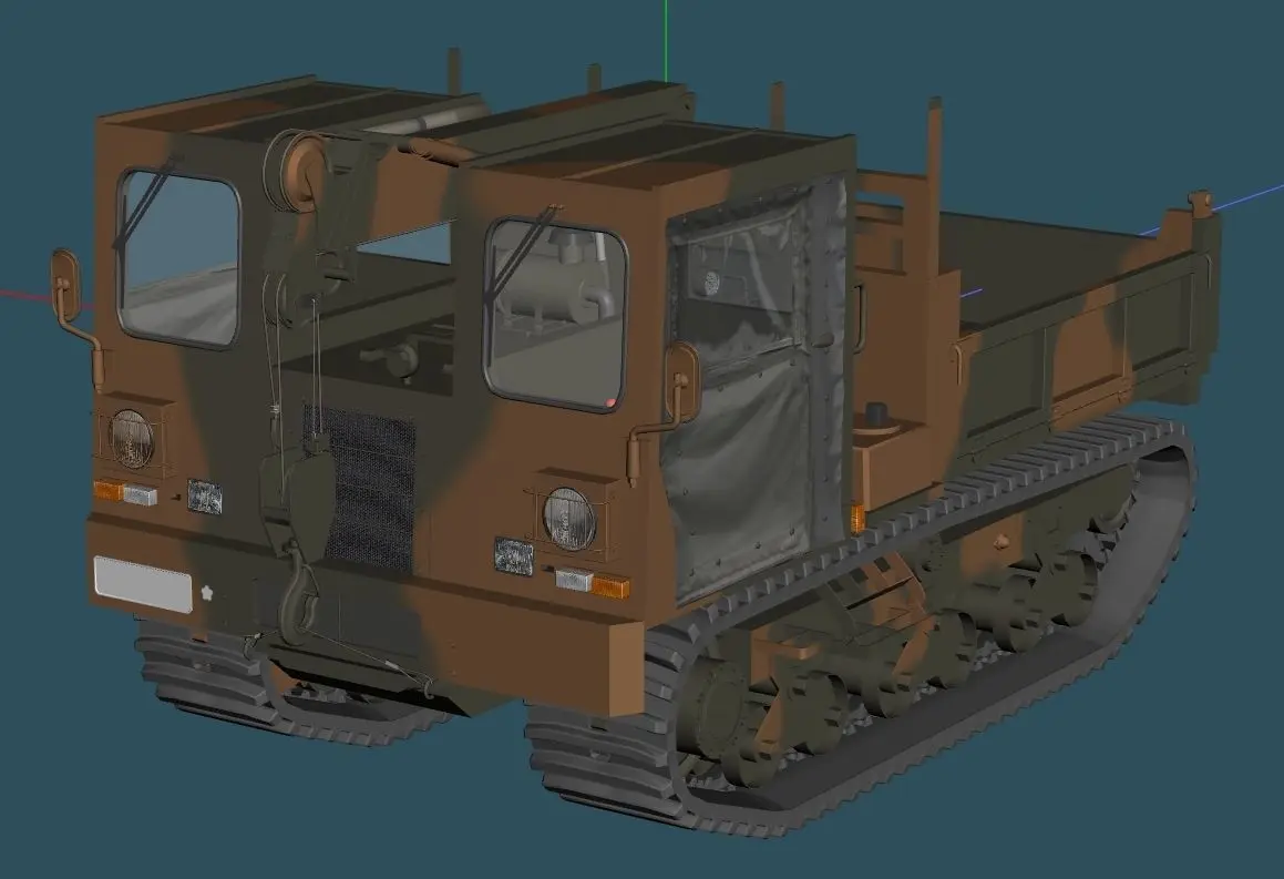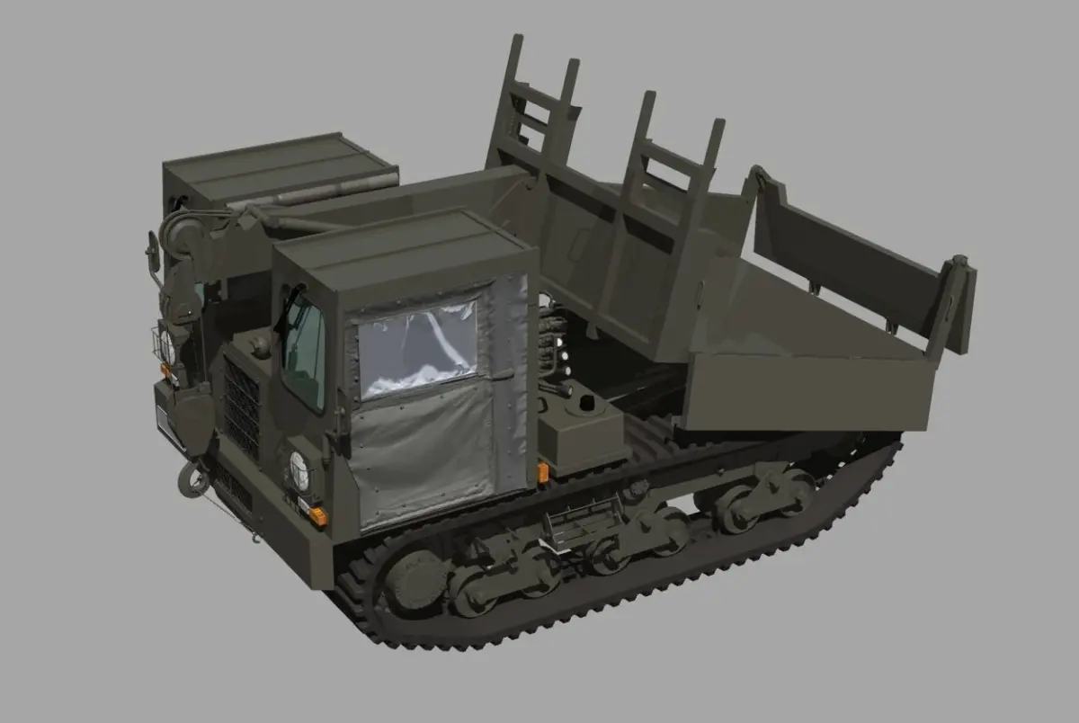日本陸上自衛隊の災害現場等不整地での活動する為のゴム履帯の作業車両です、荷台の扉各3枚、荷台、ビニル製ドア左右、ユニットクレーンは作業風景を表現したい場合任意で編集する必要が有ります。輸送時は3.5tダンプ・トラックに載せるのですが、未だ出してません作例は通常のを編集した簡易物です。今回のモデルは単色タイプと迷彩タイプの2コをセットにして有ります。