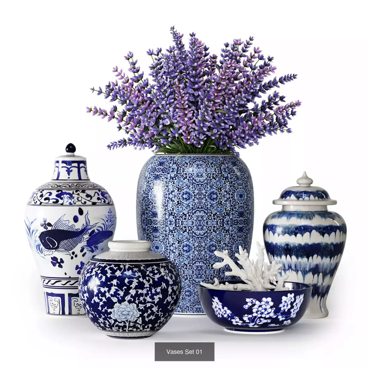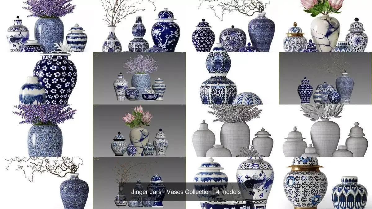 Chinese Ginger JarsThis collection contains 4 files with 20 vases with flowers composition in blue and white colors in chinese styleIn total there are 20 different hi-quality jinjer jars of differnt shapes and ornamentsAll models are made in 3ds max and compatible with Corona render and V-RayThere are also FBX and OBJ filesIf you have any issues, just ask me!