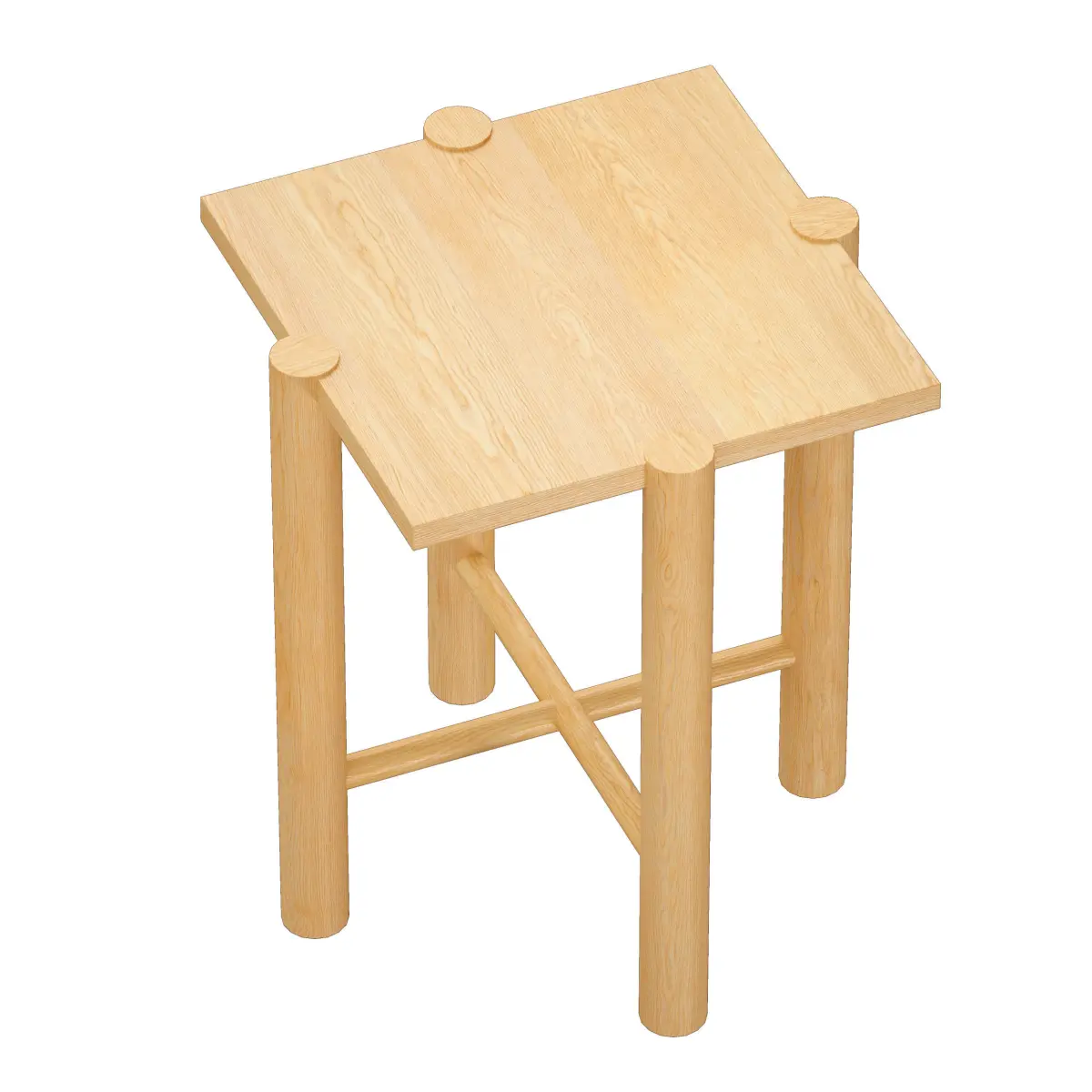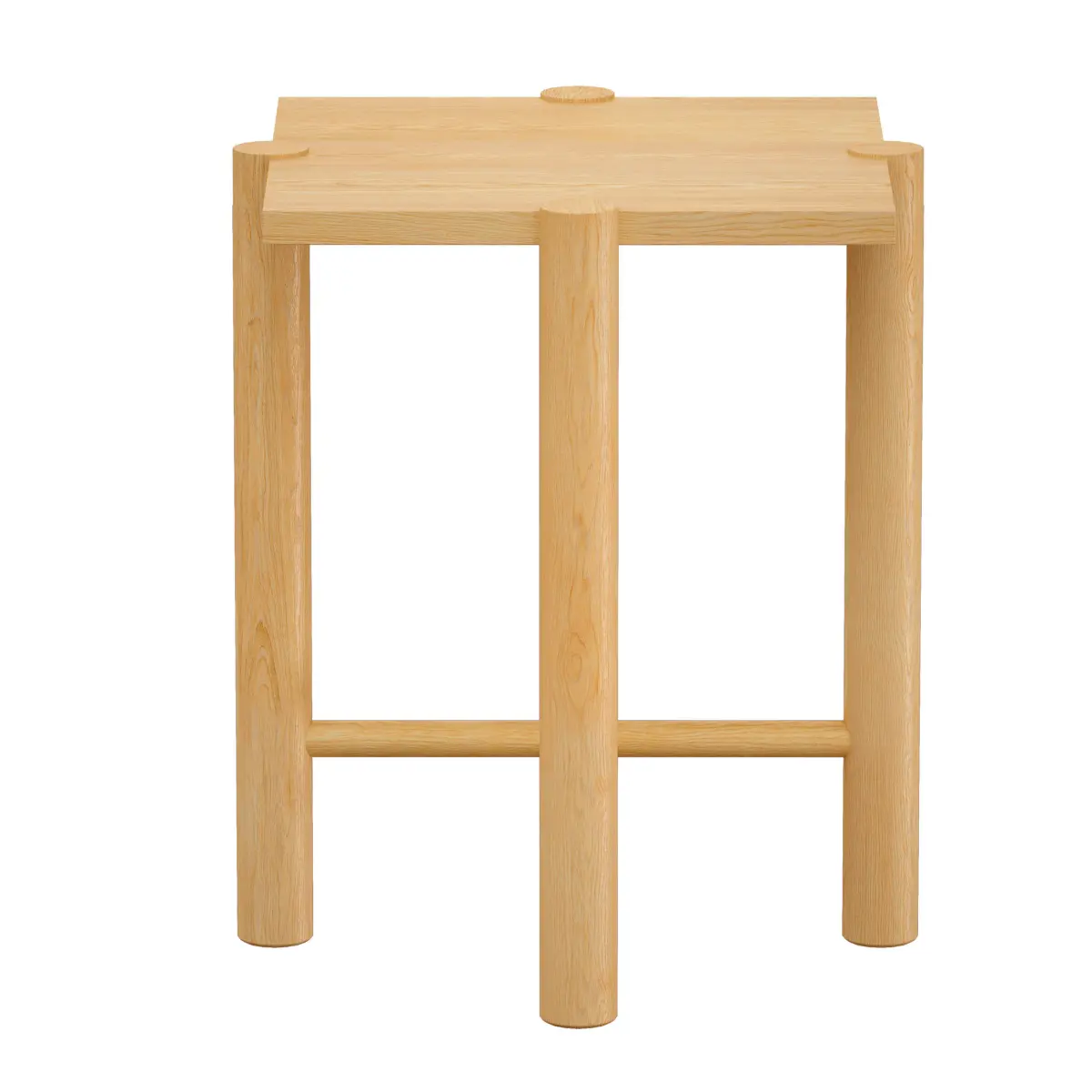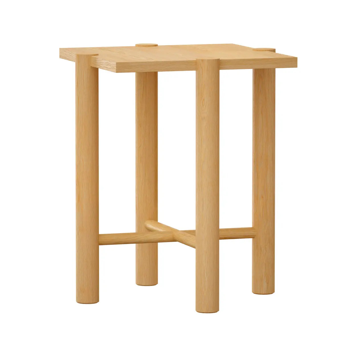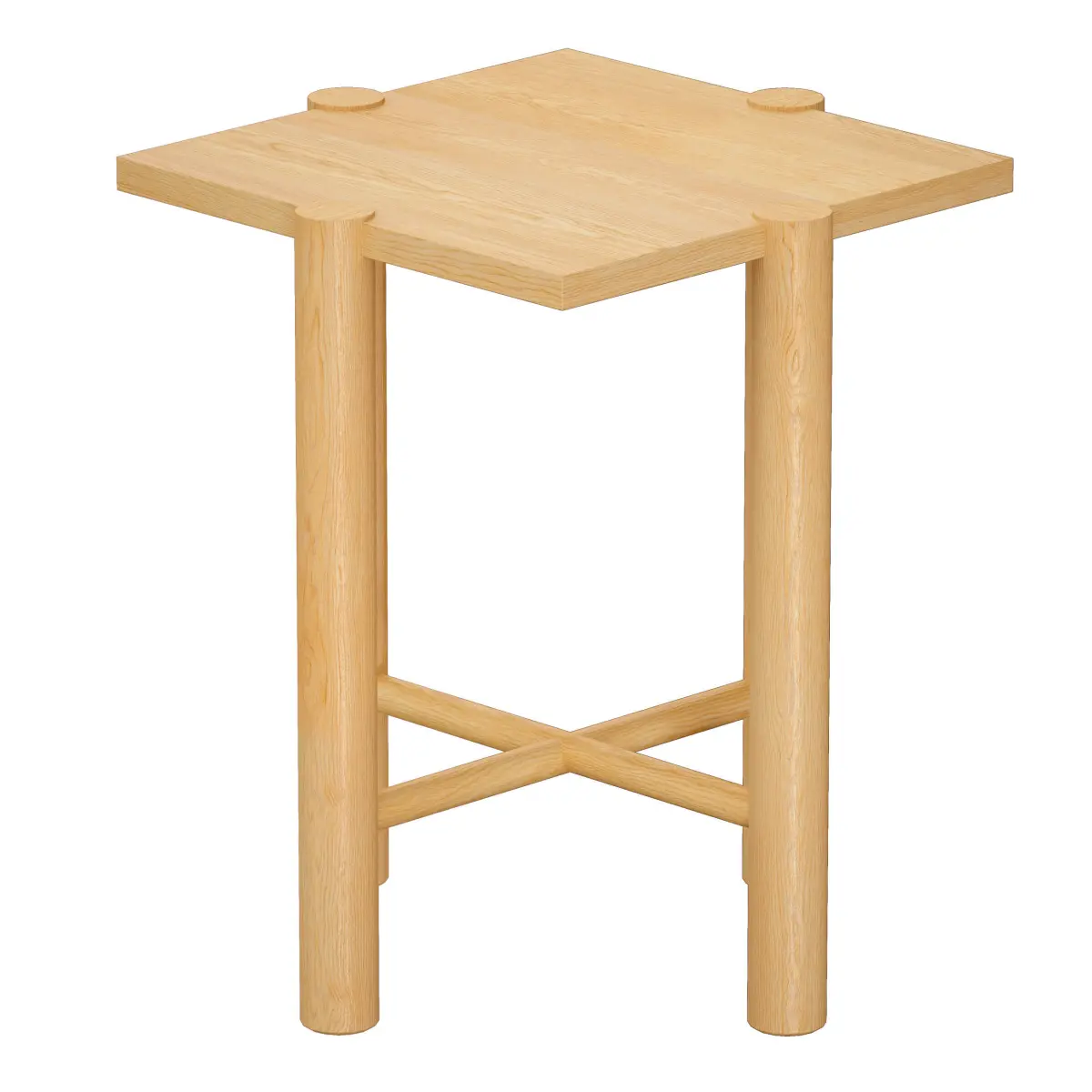 Seller Description:Our Jo end table defies expectations with an architectural design that plays outside the confines. Anchored by crisscrossed struts, round legs rise up just outside the square perimeter and flush to the table top to lend structural interest and eye-catching detail. Wirebrushing and a natural finish give the hardwood table a light look with warm wood tones and lively grain.19 Wx19 Dx22 "H